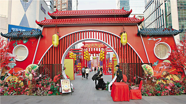 走在繁華的春熙路上,熙來攘往的人群摩肩接踵,一掃往日「新冠疫情」的陰霾。在IFS前的廣場裏,一座具有漢唐風格的巨型牌坊巍然屹立,紅色的主基調給人一種喜慶之感。整個牌坊呈梯形,中間是一道圓形拱門,兩個黃色的燈籠高高懸掛。拱門的兩邊,擺放着一罈罈繫着紅布的老酒和色彩鮮艷的油紙扇,還有各式各樣的鮮花簇擁着,現場一派喜氣洋洋。