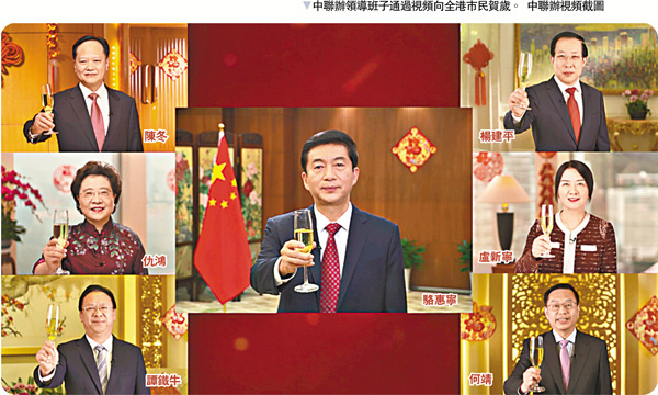 駱惠寧昨日以《讓香港這個家變得更好》為題致辭,全國政協副主席董建華、梁振英,香港特區行政長官林鄭月娥,中央駐港國安公署署長鄭雁雄,外交部駐港署理特派員楊義瑞,解放軍駐港部隊司令員陳道祥、政委蔡永中等嘉賓,和中聯辦各副主任、員工均通過「雲酒會」向社會各界送上美好的新春祝福。在有關的視頻中,還有多名市民表達新年願景,共同祝福祖國和香港愈來愈好。