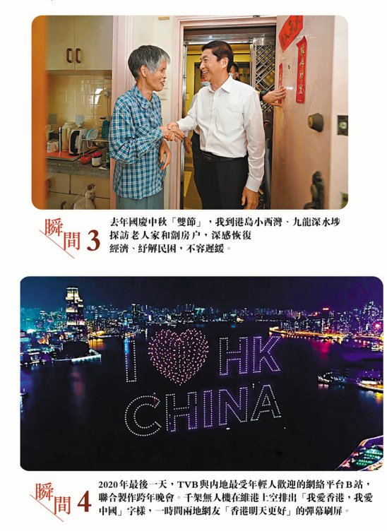他分享了過去一年的「四個難忘瞬間」,並表示很多人都在想,香港接下來會怎樣,還會有什麼變化,「我想說,變與不變,是客觀的、辯證的、發展的。過去一年的香港之『變』,是撥亂反正。把『變形』和『走樣』的都糾正過來,『一國兩制』必將沿着正確的方向行穩致遠。」