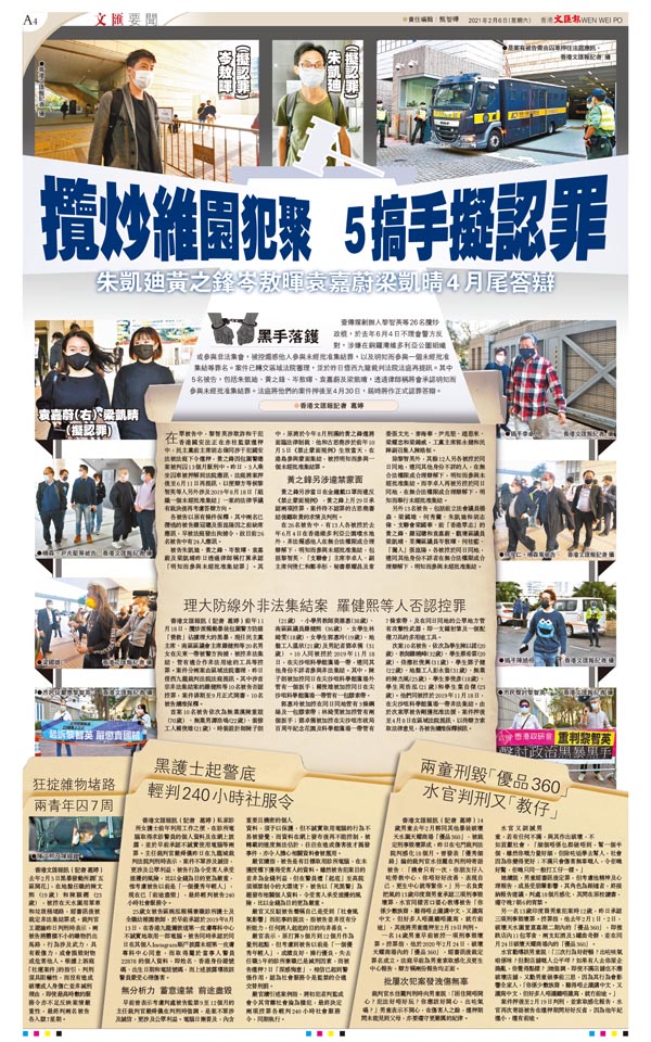 被告朱凱廸、黃之鋒、岑敖暉、袁嘉蔚及梁凱晴昨日透過律師稱打算承認「明知而參與未經批准集結罪」。其中,原將於今年8月刑滿的黃之鋒還將面臨法律制裁:他和古思堯涉於前年10月5日《禁止蒙面規例》生效當天,在港島參與蒙面集結,被控明知而參與一個未經批准集結罪。