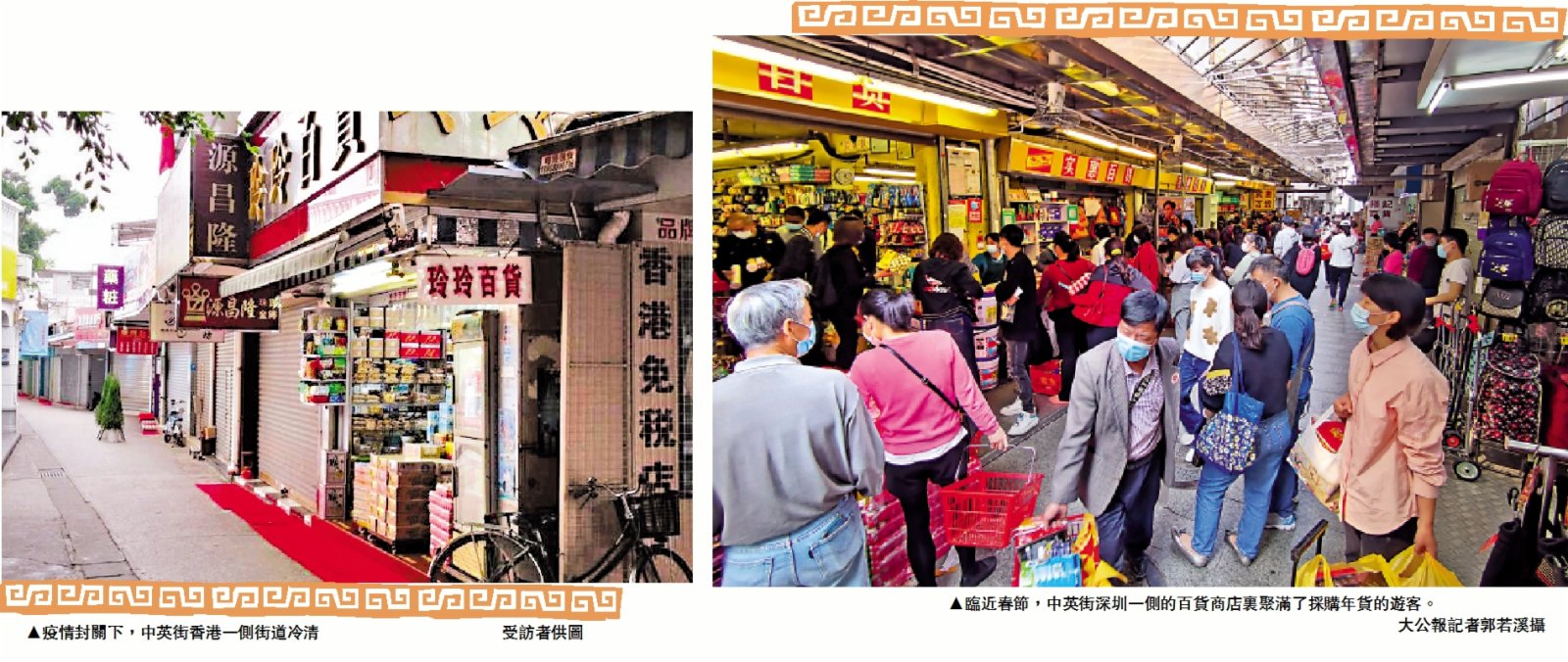 (大公報記者 郭若溪)年關將至,內地民眾開始陸續採辦年貨。受疫情影響,無法赴港採購的市民將目光投向了可以買到免稅港貨的中英街。曾經的中英街沿街店舖近百家,是許多遊客的「購物勝地」。然而出於防控的需要,如今中英街被圍欄一分為二。一邊是熙熙攘攘,人潮湧動購物的繁榮景象;另一邊則是慘淡的關門歇業之景。一街兩制,營商兩世界。望着深圳店舖熱鬧的景象,香港商家出招將倉庫變臨舖,用招牌打廣告等攬客。