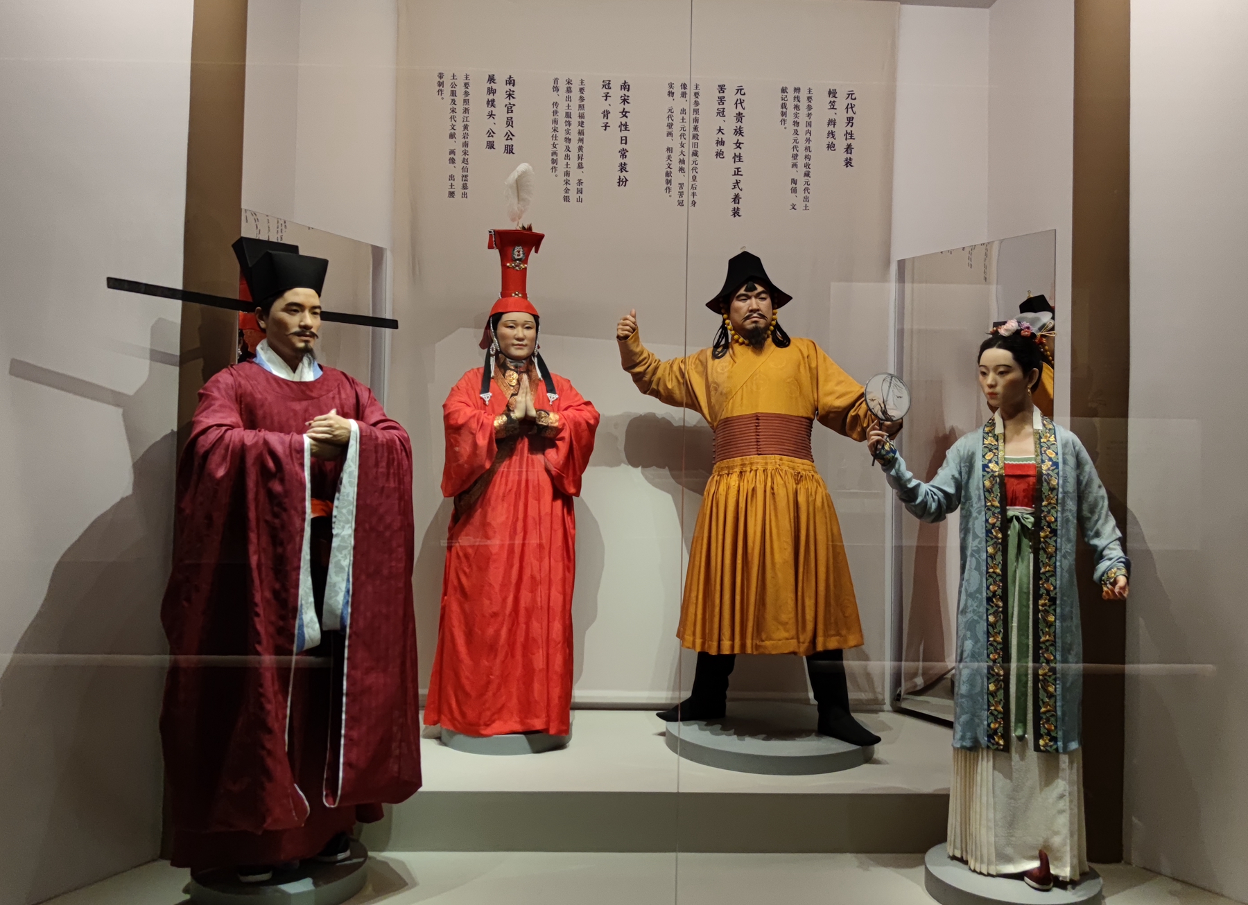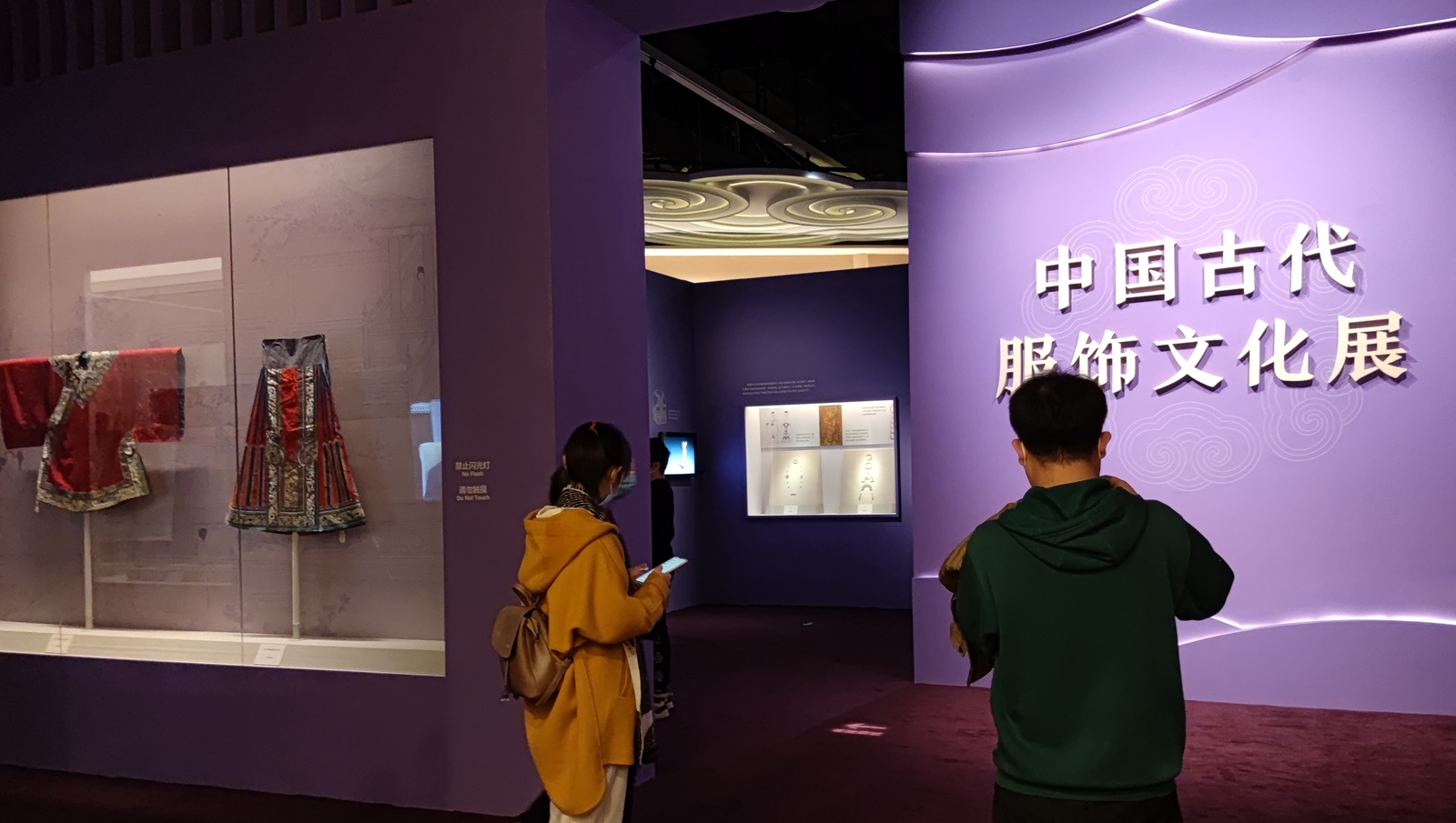 展覽分為「先秦服飾」、「秦漢魏晉南北朝服飾」、「隋唐五代服飾」、「宋遼金西夏元服飾」、「明代服飾」、「清代服飾」六個部分,全面系統地回顧了中國各歷史時期的主要服飾形制及其背後所包含的服飾文化,較為概括地闡釋了中國服飾史上發生的三次重大變革:新石器時代華夏族上衣下裳、束髮為髻是中國服飾演變之原點;戰國時期發生以趙武靈王「胡服騎射」為標誌、深衣流行為結果的第一次服飾大變革;從南北朝到唐代,中國服飾由漢魏時的單一系統,變成華夏、鮮卑兩個來源之複合系統,由單軌制變為雙軌制,這是中國服飾史上第二次大變革;到清代,男子改着滿族服飾,華夏傳統服制斷檔,是為中國服飾史上第三次大變革。