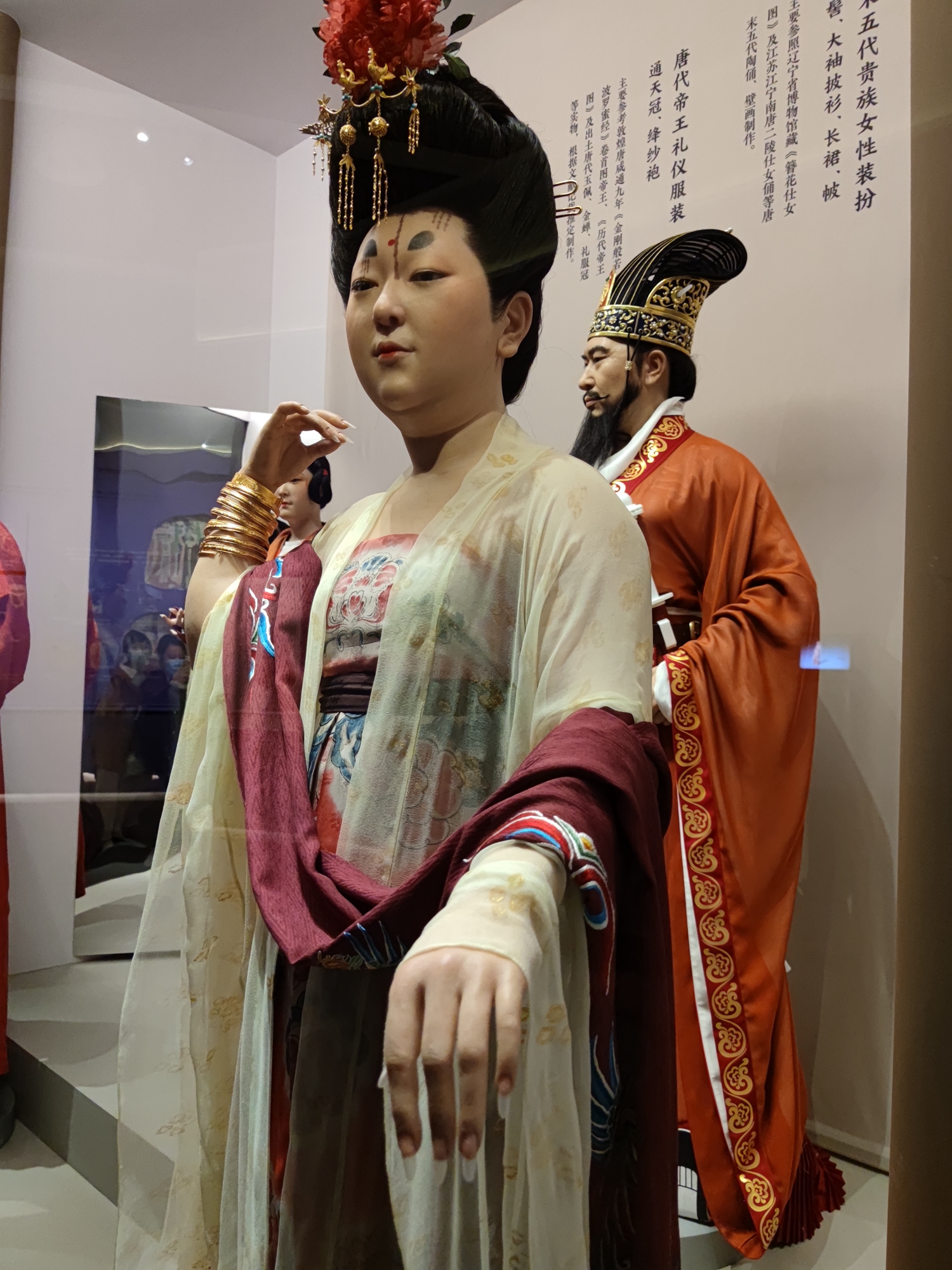除了大量直接表現古代服飾形制的實物,展覽還繪製了大量線圖、製作了15尊不同時代的服飾復原人像,力求完整呈現中國古代衣冠配飾的整體形象,充分展示中國古代物質文明和精神文明的燦爛成就,一定意義上可以說是立體版的中國古代服飾簡史。