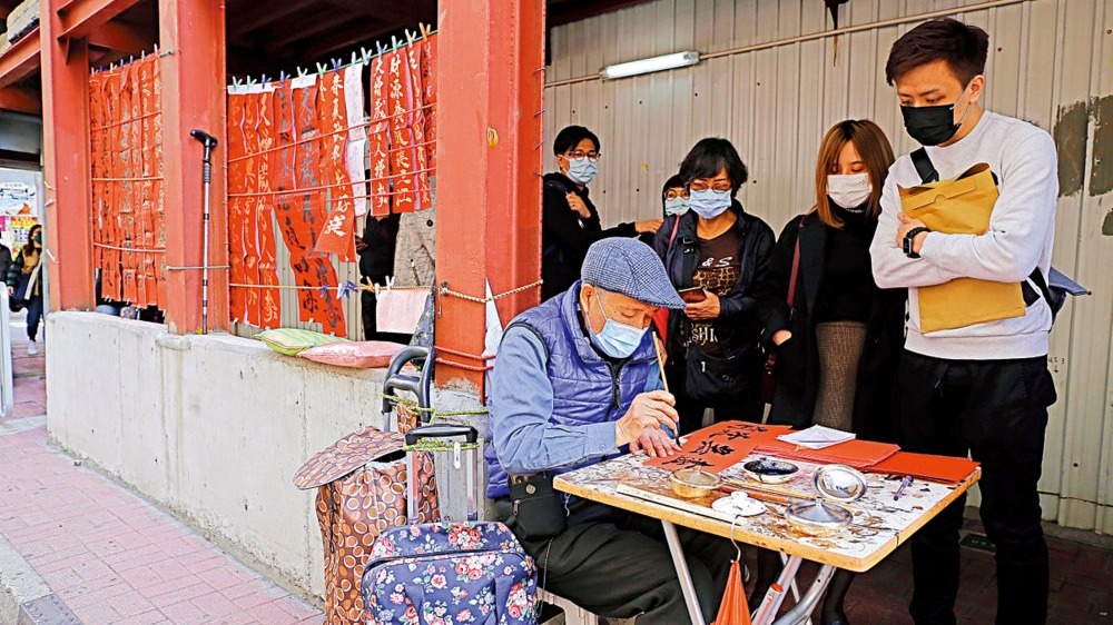 (大公報 記者 李亞清、賀仁)在街頭寫揮春十多年,陳伯(陳鑫發)堪稱「揮春專家」,老人家說:「今年多人買的揮春,五成跟健康有關,『身體健康』呀、『平安是福』呀!」老人家加入創意,今年還推出「百疫不侵」。