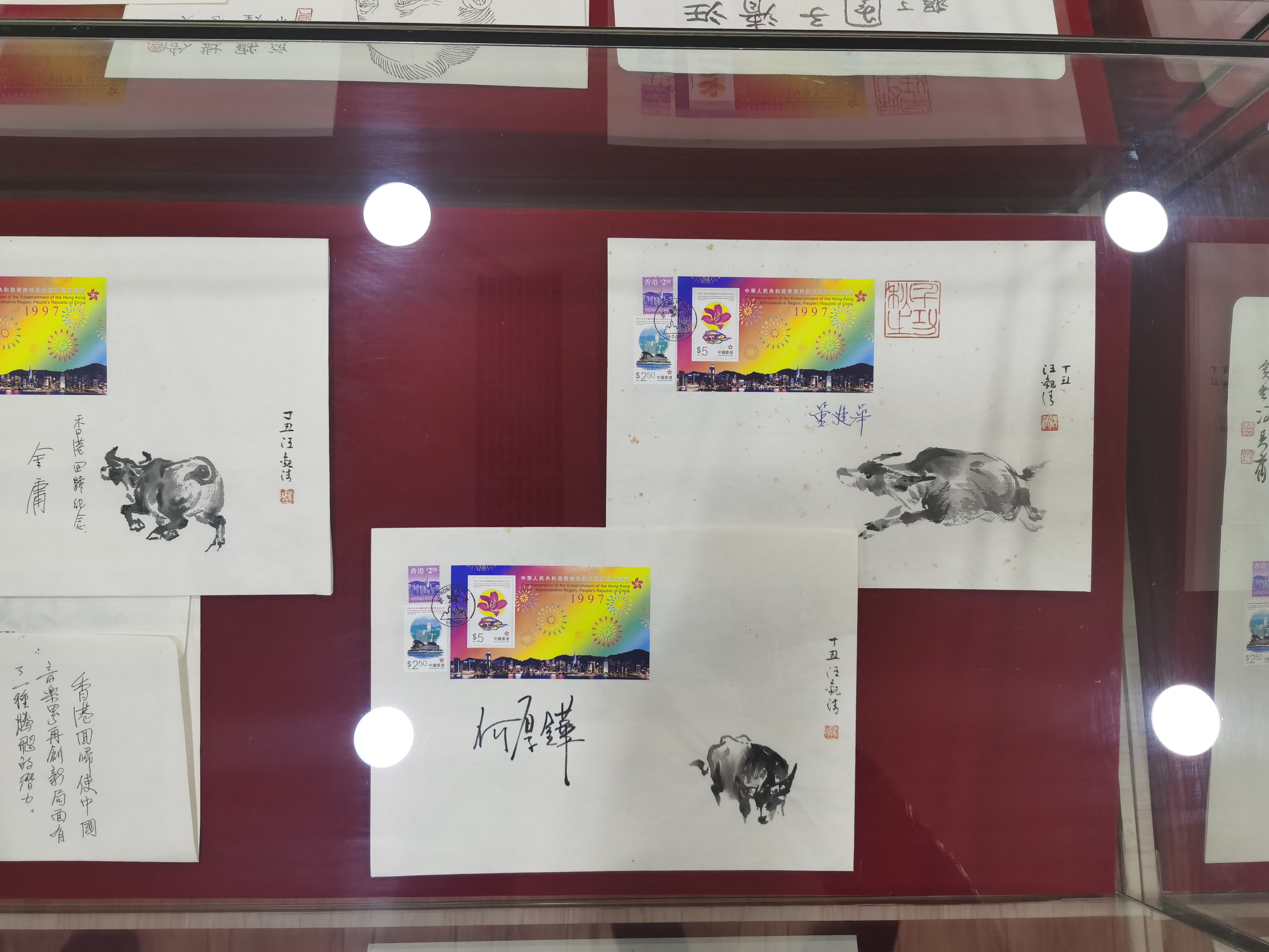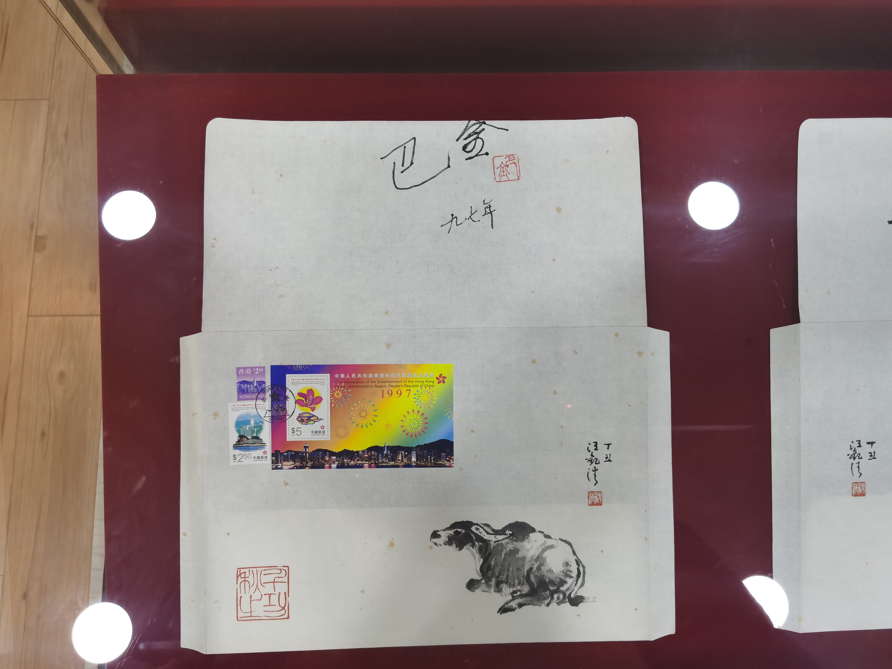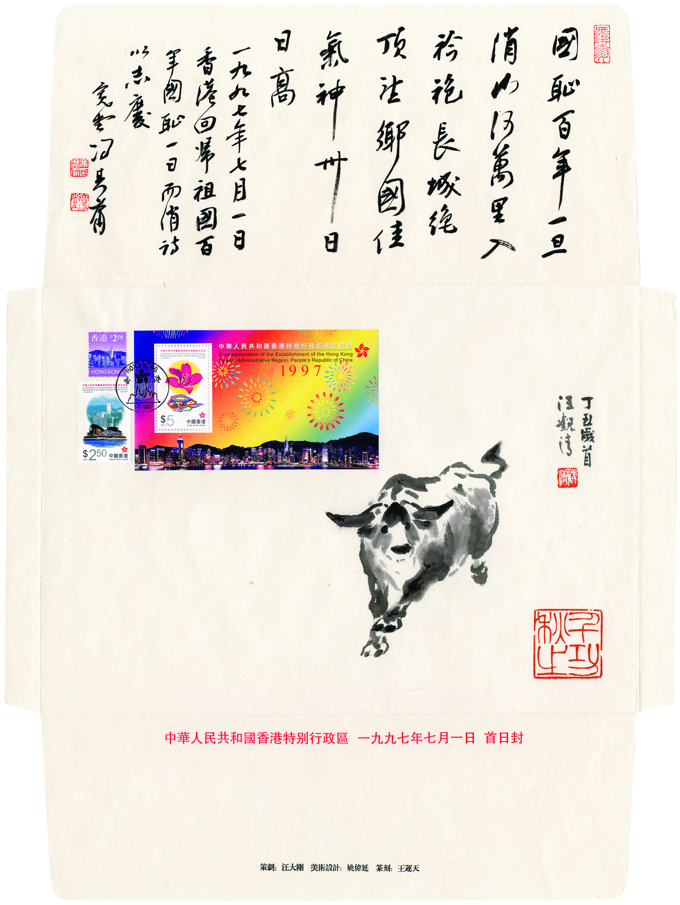 那一年,這三位老友聚於上海,二人聽聞汪老的想法很是肯定,並欣然首簽。記者在汪老家中看到,馮其庸先生選了一枚七月一日的奔牛信封,賦詩一首:國恥百年一旦消,山河萬里入衿袍。長城絕頂望鄉國,佳氣神州日日高;楊仁愷先生則選了一封回首牛,也題詩:九七即屆香江歸,國土重光迎節輝。百載恥辱一旦雪,萬民共慶千秋基。