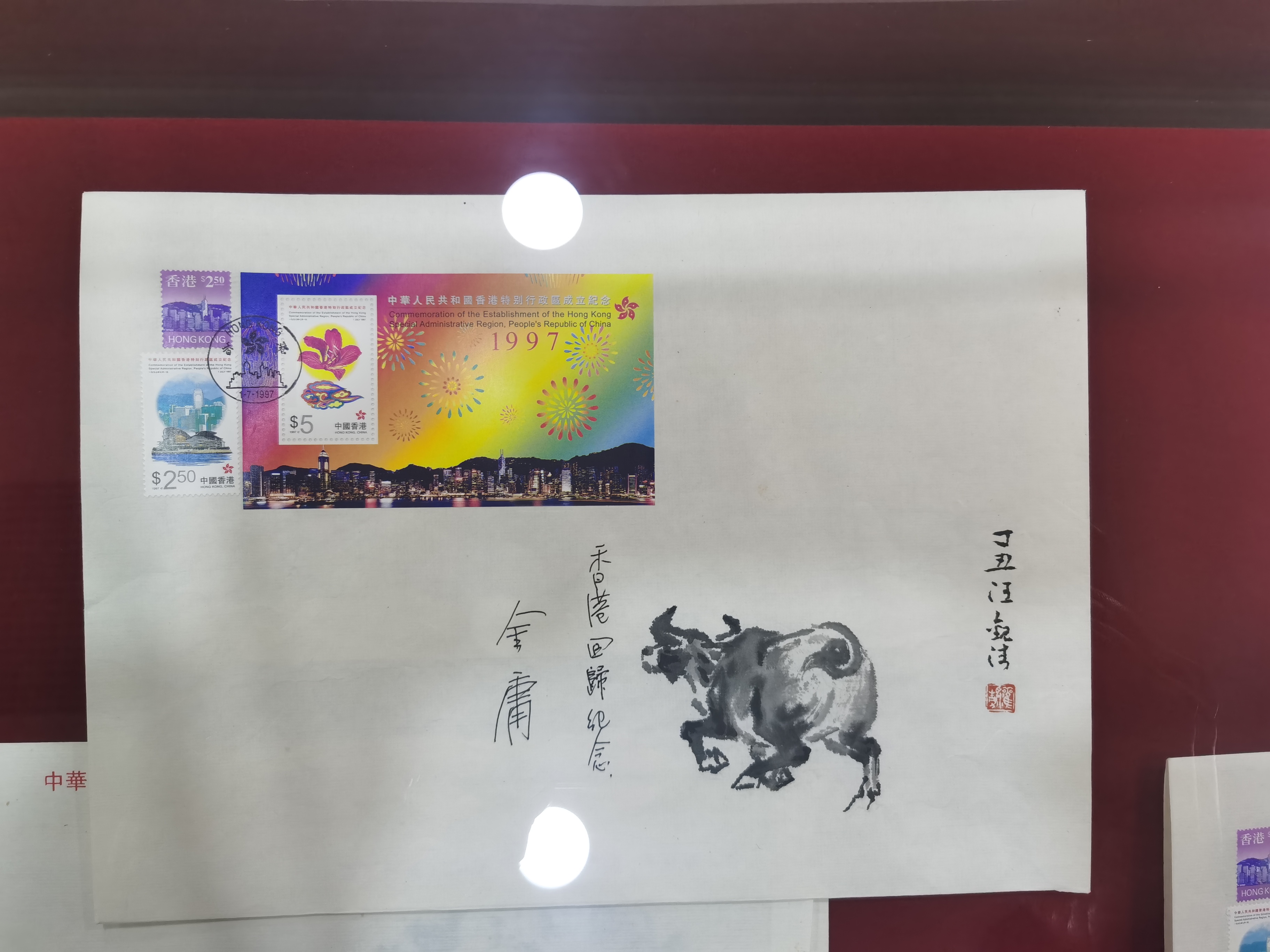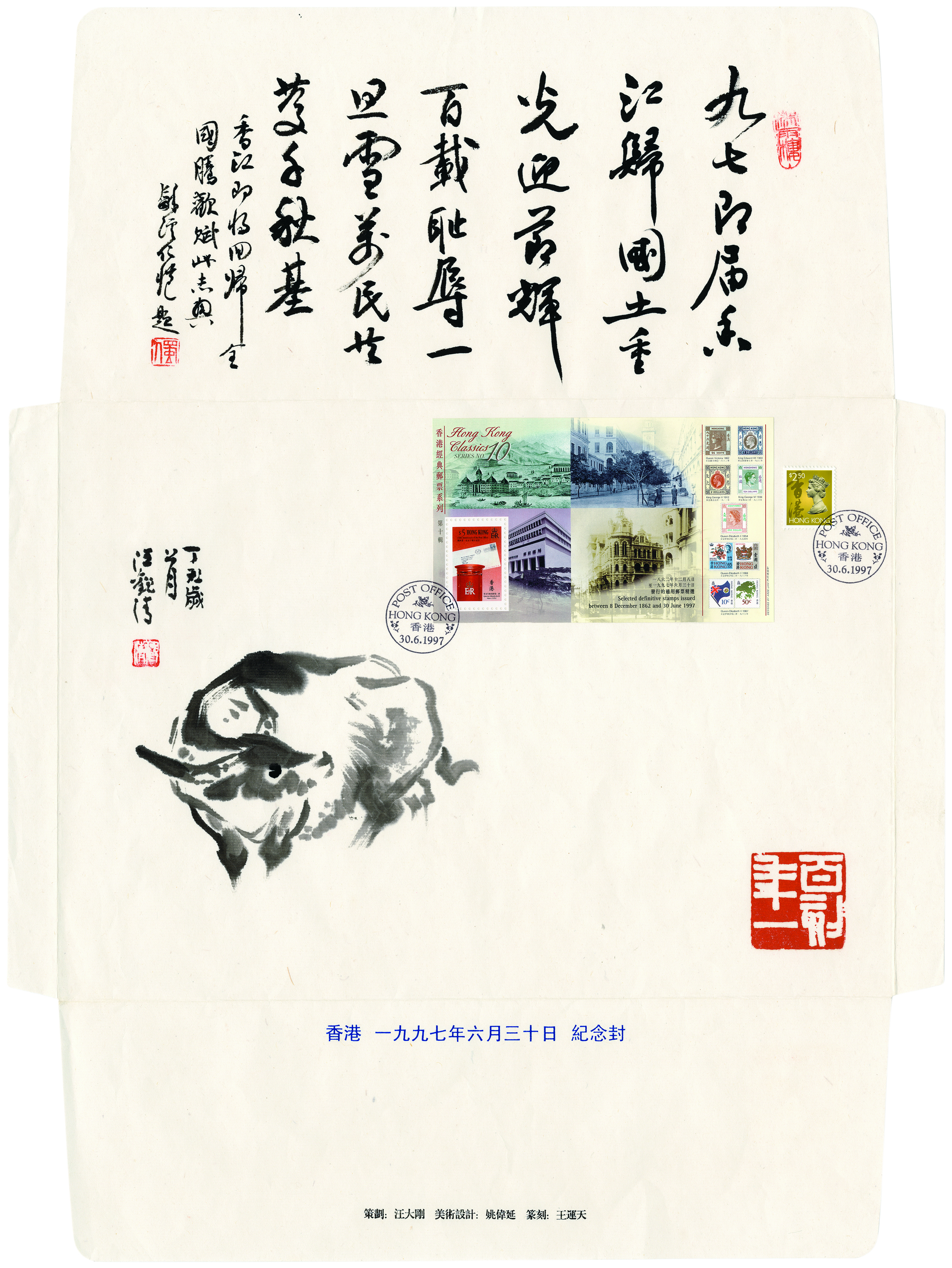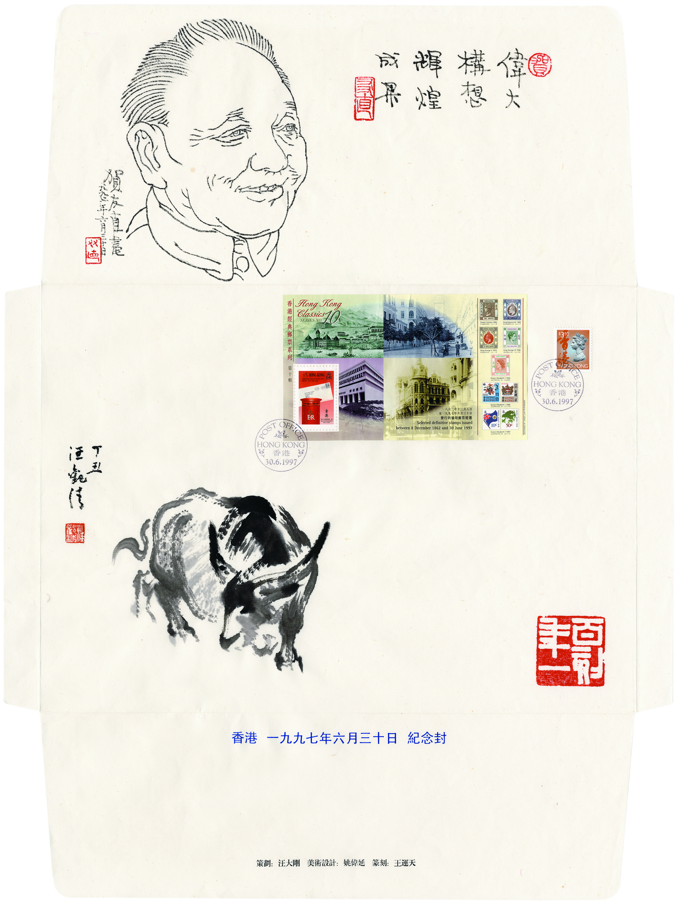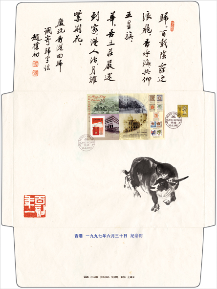 那一年,這三位老友聚於上海,二人聽聞汪老的想法很是肯定,並欣然首簽。記者在汪老家中看到,馮其庸先生選了一枚七月一日的奔牛信封,賦詩一首:國恥百年一旦消,山河萬里入衿袍。長城絕頂望鄉國,佳氣神州日日高;楊仁愷先生則選了一封回首牛,也題詩:九七即屆香江歸,國土重光迎節輝。百載恥辱一旦雪,萬民共慶千秋基。