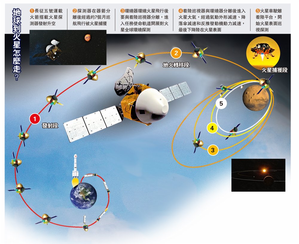 (大公報記者 劉凝哲)2021年2月10日19時52分,中國首次火星探測任務天問一號探測器實施近火捕獲制動,環繞器3000N軌控發動機點火工作約15分鐘,距離地球約1.92億公里的探測器順利進入環火軌道,成為中國第一顆人造火星衛星,實現「繞、着、巡」第一步「繞」的目標。火星引力的「捕獲窗口」有限,要求探測器在15分鐘內將速度從28km/s(公里每秒)降低至約1km/s。在數據通信單向時間延遲超過10.7分鐘的情況下,探測器必須完全依靠自身實現點火方向和點火時長的精確控制,分秒不差。