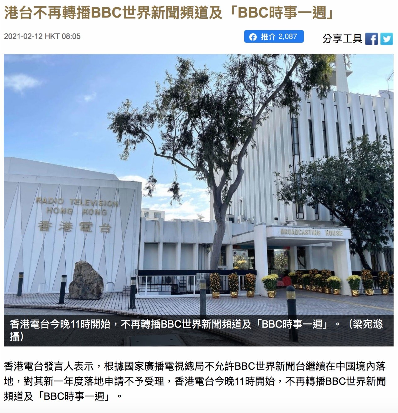 大文新聞網報道,香港電台今日(12日)宣布,根據國家廣播電視總局不允許BBC世界新聞台繼續在中國境內落地,對其新一年度落地申請不予受理,香港電台今晚11時開始,不再轉播BBC世界新聞頻道及「BBC時事一周」。