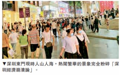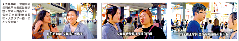 她將當時拍攝的視頻拿出來給大公報記者看,記者見到視頻中的東門熙熙攘攘。「深圳經濟是不是已經崩潰了?」「人流是少了一些,但不至於到崩潰。」畫面中受訪者紛紛表示不認同境外網民的說法,有路人指出,與過去正常時候相比,疫情之下的東門人流的確少了一些,深圳靠近香港,香港疫情嚴重,東門要嚴加防範。
