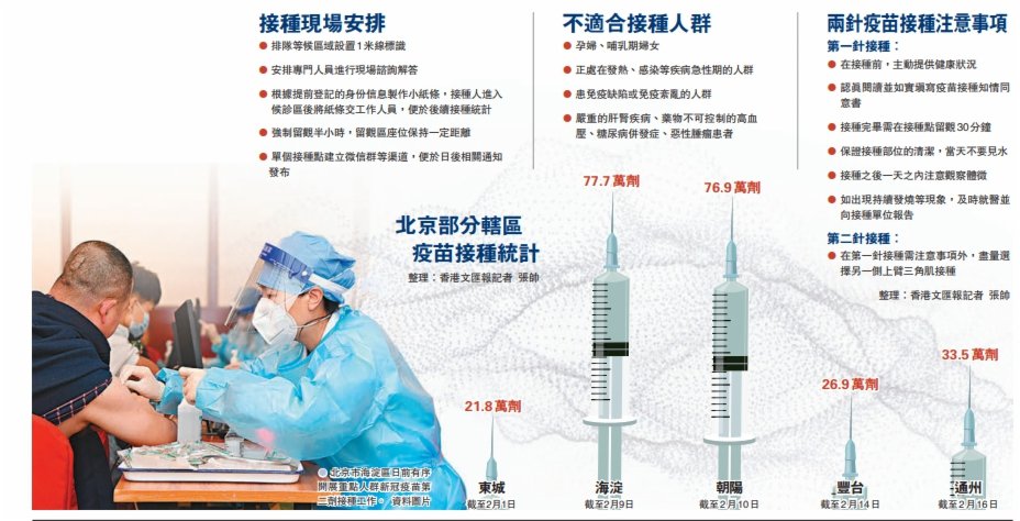 (香港文匯報 記者 張帥)疫苗接種是新冠肺炎疫情防控最經濟、最有效的措施,而有序高效的培訓、預約、組織實施是疫苗接種順利進行的重要保障。北京市疾控中心近日介紹,北京已基本完成九類重點人群的疫苗接種,多數人接種疫苗無不良反應。香港文匯報獲悉,春節假期過後,北京下轄多區已正式啟動大規模接種工作,逾百個接種點啟用,各區單日疫苗接種能力均在萬人以上。