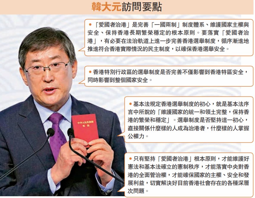 韓大元表示,早在1984年6月,鄧小平同志明確提出,「港人治港」有個界線和標準,就是必須由以愛國者為主體的港人來治理香港,並對愛國者提出三個標準:尊重自己民族,誠心誠意擁護祖國恢復行使對香港的主權,不損害香港的繁榮和穩定。愛國就是熱愛自己國家,始終對祖國保持着深厚感情。這是對治港者最低限度的法律與政治倫理要求。不久前,習近平主席提出,要確保「一國兩制」實踐行穩致遠,必須始終堅持「愛國者治港」。這既是對「一國兩制」核心精神的全面闡釋,也是對「一國兩制」制度體系下堅守「一國」原則,使香港長期保持繁榮穩定的行動指南。只有堅持「愛國者治港」根本原則,才能維護好憲法和基本法確立的憲制秩序,才能落實中央對香港的全面管治權,才能確保國家的主權、安全和發展利益,切實解決好目前香港社會存在的各種深層次問題。
