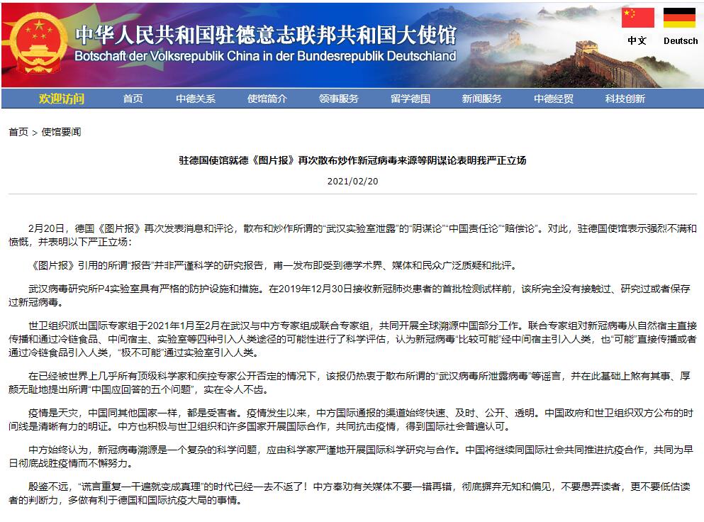 2月20日,德國《圖片報》再次發表消息和評論,散布和炒作所謂的新冠病毒「武漢實驗室洩露」的「陰謀論」「中國責任論」「賠償論」。對此,中國駐德國大使館當天在官網刊登聲明表示強烈不滿和憤慨,並表明嚴正立場。