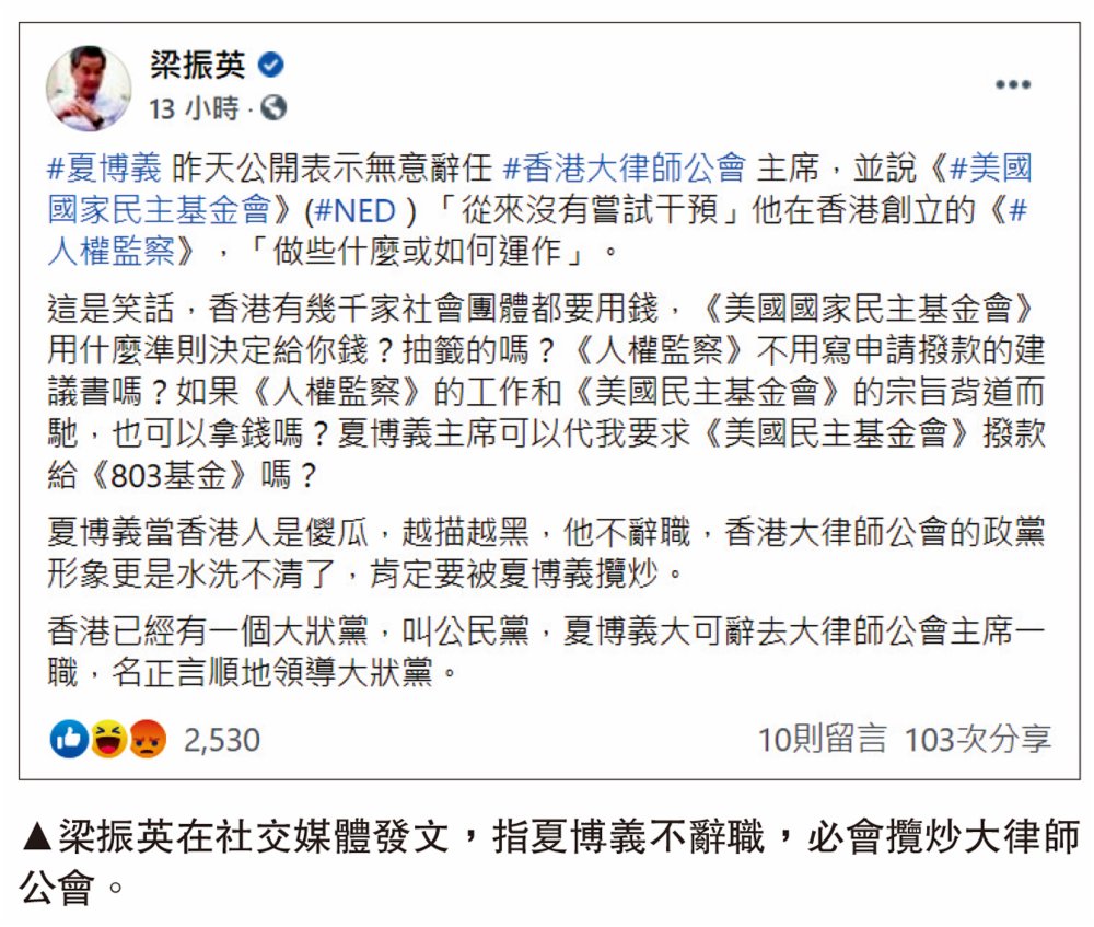 (大公報記者 冼國強)全國政協副主席梁振英昨日在社交媒體發文指出,新任大律師公會主席夏博義(小圖)對其創立的「香港人權監察」接受美國國家民主基金會(NED)捐款「越描越黑」。梁振英表示,大律師公會應該是一個專業團體,夏博義再不辭職,大律師公會的政黨形象更是水洗不清,肯定要被夏博義攬炒。