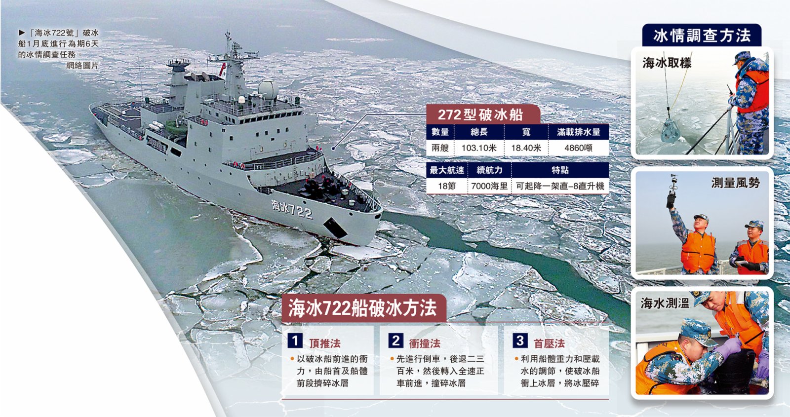 (大公報 記者 馬浩亮)「海冰722號」破冰船1月底進行為期6天的冰情調查任務,獲取了大量冰情、水文、氣象數據。該船是中國海軍新一代272型破冰船的1號船,在北方冬季冰凍期,為艦艇部隊安全清除有「白色殺手」之稱的海冰,提供海上作戰訓練和航行的支援保障,在海軍艦艇體系中佔據不可替代的特殊地位,是航空母艦冰海前航的開路先鋒。