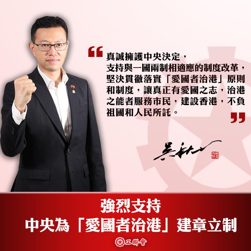 最後,吳秋北表示堅決擁護中央決定,支持一切與一國兩制相適應的制度改革,堅決貫徹落實「愛國者治港」理念和制度,讓真正有愛國之志,治港之能者服務市民,建設香港,不負祖國和人民所託。