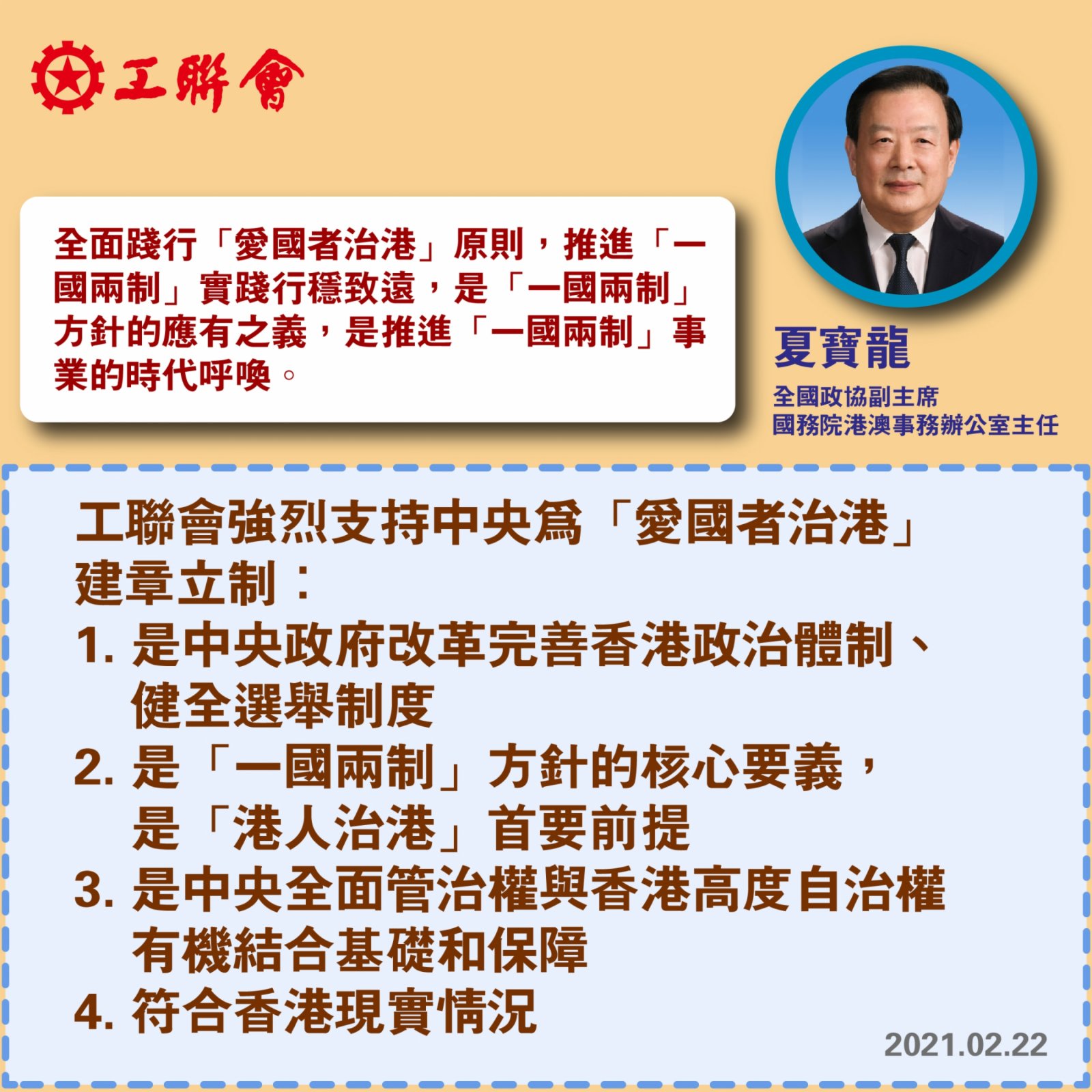 工聯會表示,今天全國政協副主席、國務院港澳辦主任夏寶龍發表關於「愛國者治港」的重要講話,工聯會完全贊同!工聯會理解支持中央改革完善香港政治體制、健全選舉制度。工聯會認為「愛國者治港」原則是「一國兩制」方針的核心要義,是港人治港的首要前提。是推進「一國兩制」事業的時代呼喚,是中央全面管治權與特別行政區高度自治權有機結合的基礎和保障。符合香港現實情況。