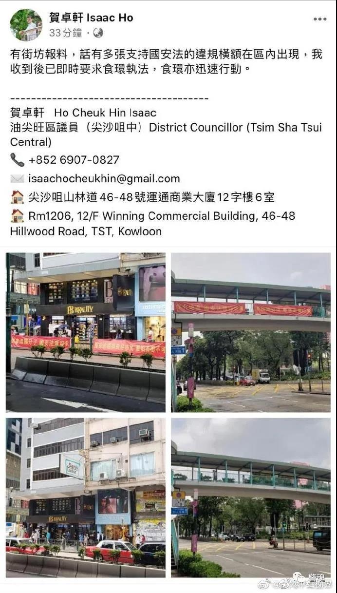 第一件事,在去年5月時,在中央將就香港國安立法的消息傳出之後,有愛國市民、組織在香港街區掛「支持國安立法」的條幅。有「港獨」分子賀卓軒在社交網絡上就立即舉報給香港食環署。結果與愛國市民舉報「港獨」文宣置之不理完全不同的是,食環署迅速行動,把「支持國安立法」的條幅給清除了。其速度之快、責任心之強,讓人驚奇!