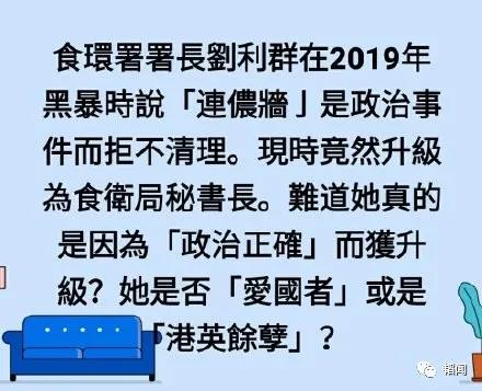 有港人在社交媒體上就發出質疑:說「流膿墻」是政治事件而拒不清理的食環署長劉利群難道真的是因為「政治正確」而獲升級?她是「愛國者」還是「港英餘孽」?