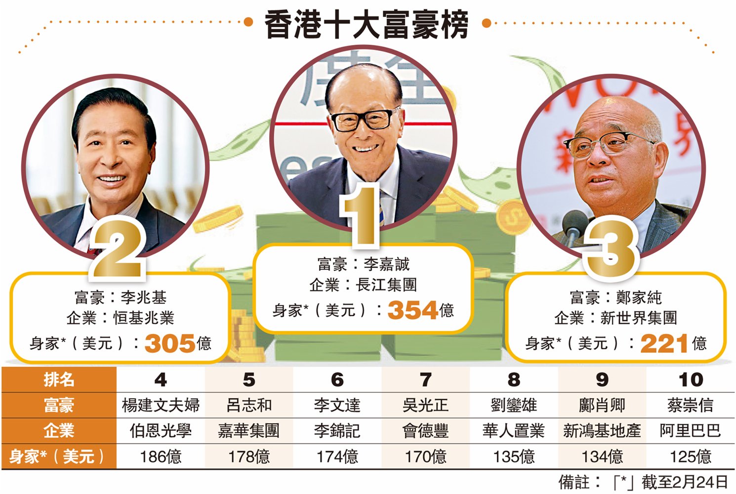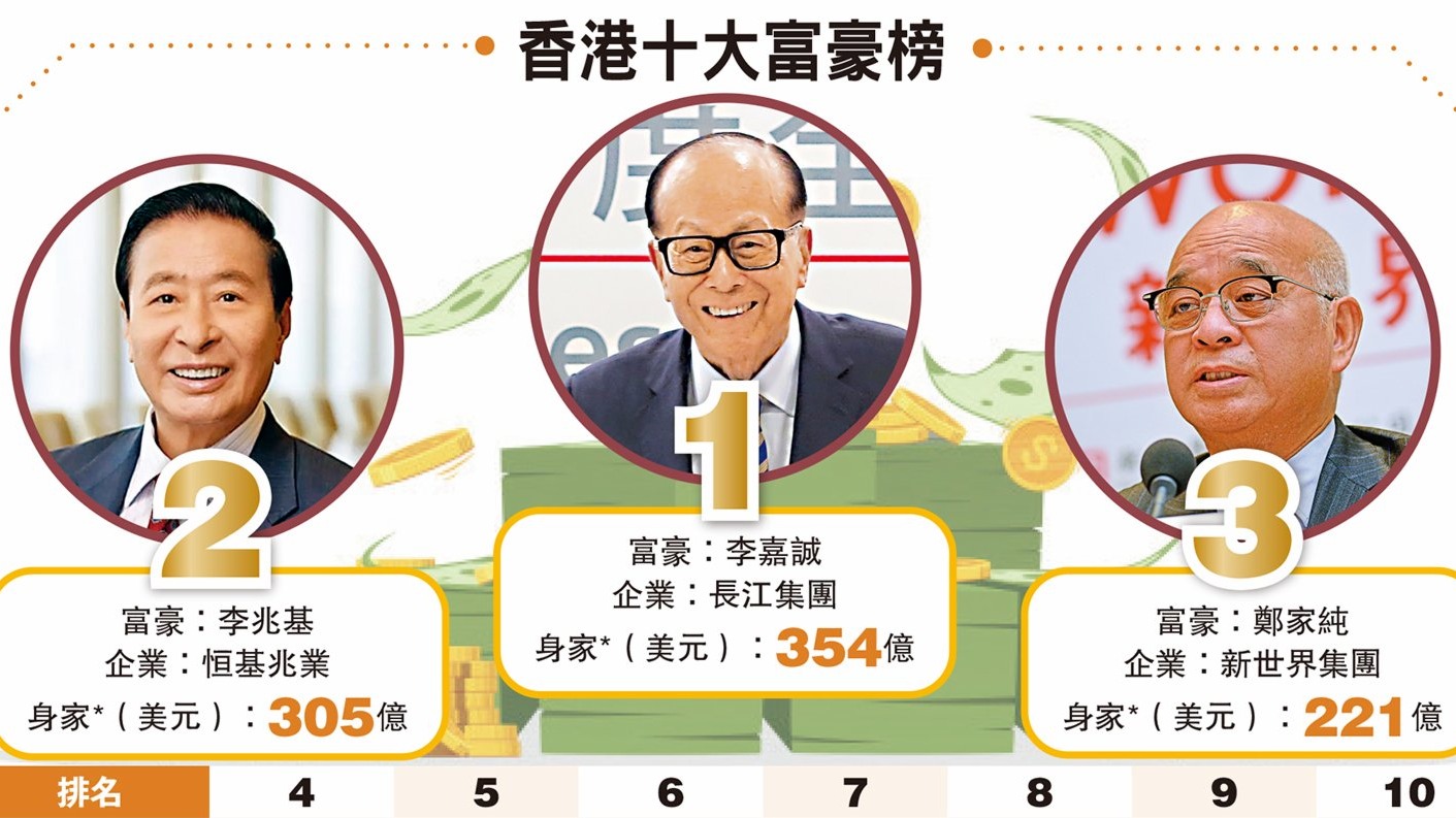香港富豪榜第二位的恒基地產創辦人李兆基,去年財富總額幾近紋絲未動,僅上升1億美元(約7.8億港元)至305億美元(約2379億港元)。繼續排名第三位的新世界發展(00017)主席鄭家純,身家有221億美元(約1724億港元),上升約7%。