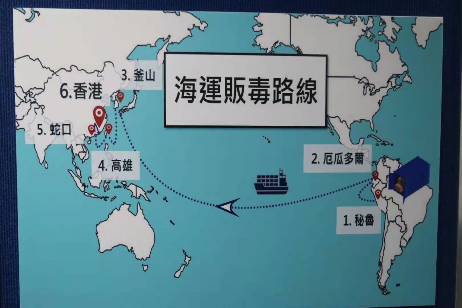 海關指,販毒集團今次利用極迂迴的路線避開人員偵查,這批毒品先由秘魯寄出,途經釜山、厄瓜多爾、高雄、蛇口等多個港口再抵達,相信會再經陸路運往內地,但不排除有毒販趁貨櫃停留在港的時候,再將毒品偷運入境。