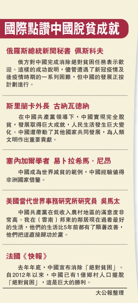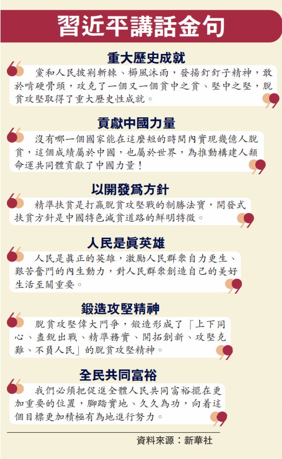 大公報報道,全國脫貧攻堅總結表彰大會25日上午在北京人民大會堂隆重舉行。中共中央總書記、國家主席、中央軍委主席習近平向全國脫貧攻堅楷模榮譽稱號獲得者等頒獎並發表重要講話。習近平莊嚴宣告,經過全黨全國各族人民共同努力,在迎來中國共產黨成立一百周年的重要時刻,我國脫貧攻堅戰取得了全面勝利,現行標準下9899萬農村貧困人口全部脫貧,832個貧困縣全部摘帽,12.8萬個貧困村全部出列,區域性整體貧困得到解決,完成了消除絕對貧困的艱巨任務,創造了又一個彪炳史冊的人間奇跡!這是中國人民的偉大光榮,是中國共產黨的偉大光榮,是中華民族的偉大光榮。
