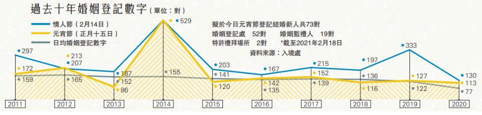 元宵和情人節一向都是港人結婚的熱門日子,兩個節日每十年會相遇一次。