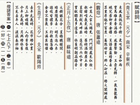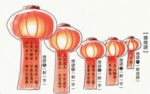 元宵節的花燈貼有謎語,猜燈謎又稱打燈謎,據說從南宋開始流行。南宋周密在《武林舊事》中雲:「以絹燈剪寫詩詞,時寓譏笑,及畫人物,藏頭隱語,及舊京諢語,戲弄行人。」這「藏頭隱語」,即謎語。古代男子為給佳人留好印象,證明自己的才學,會透過猜燈謎表現自己。燈謎的內容與生活息息相關,玄妙有趣。元宵佳節,亦是文人鍾情的題材,自古多有文學作品描繪這夜風光。