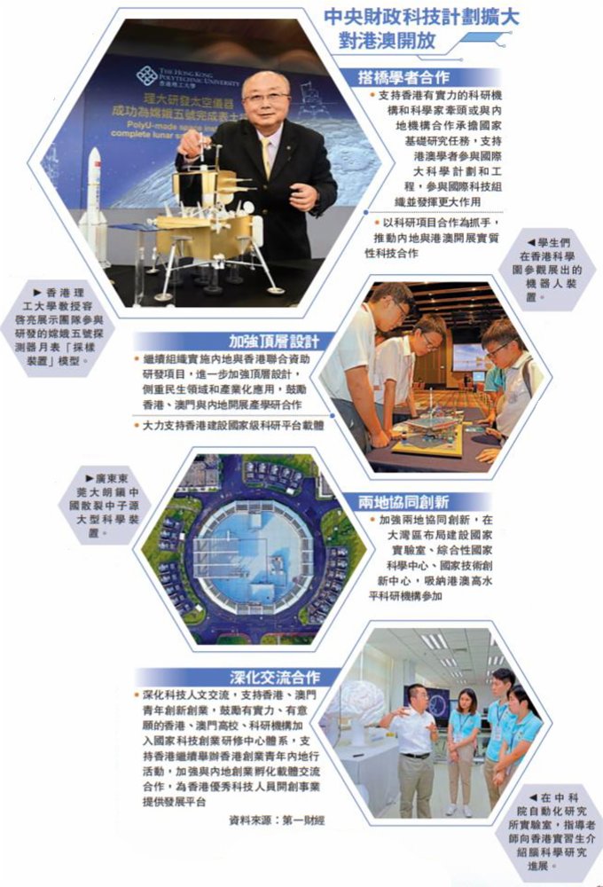 在具體措施方面,王志剛表示,首先將進一步擴大中央財政科技計劃對港澳開放。支持香港有實力的科研機構和科學家牽頭或與內地機構合作承擔國家基礎研究任務,支持港澳學者參與國際大科學計劃和工程,參與國際科技組織並發揮更大作用。據了解,科技部、財政部此前就港澳參與中央財政科技計劃出台相關試行規定,明確港澳高校、科研機構可通過競爭擇優方式承擔中央財政科技計劃項目,並獲得項目經費資助。