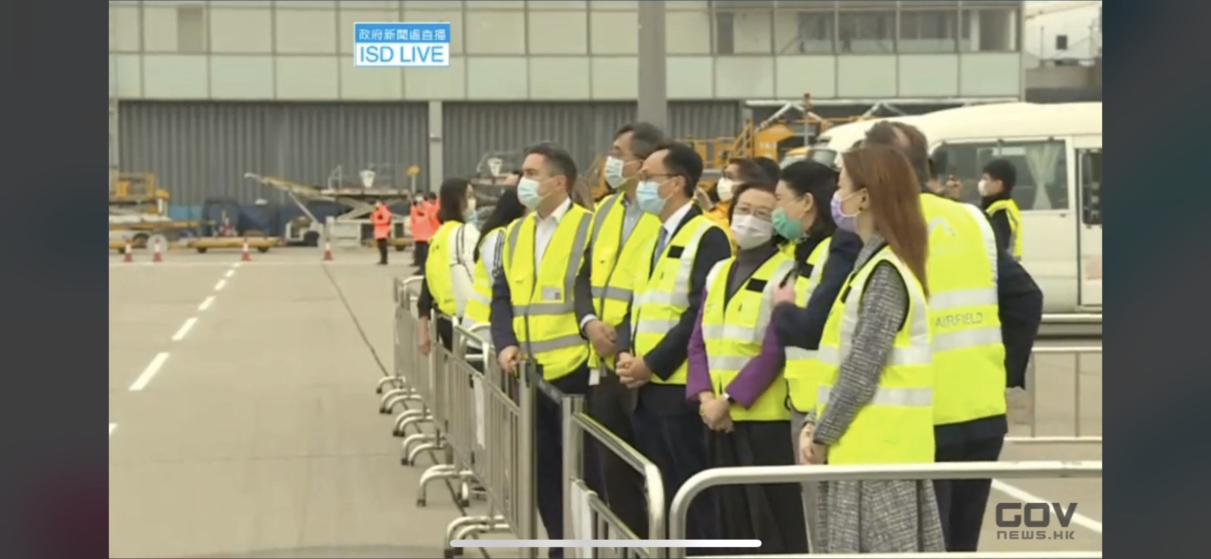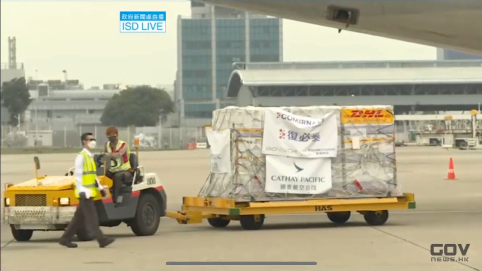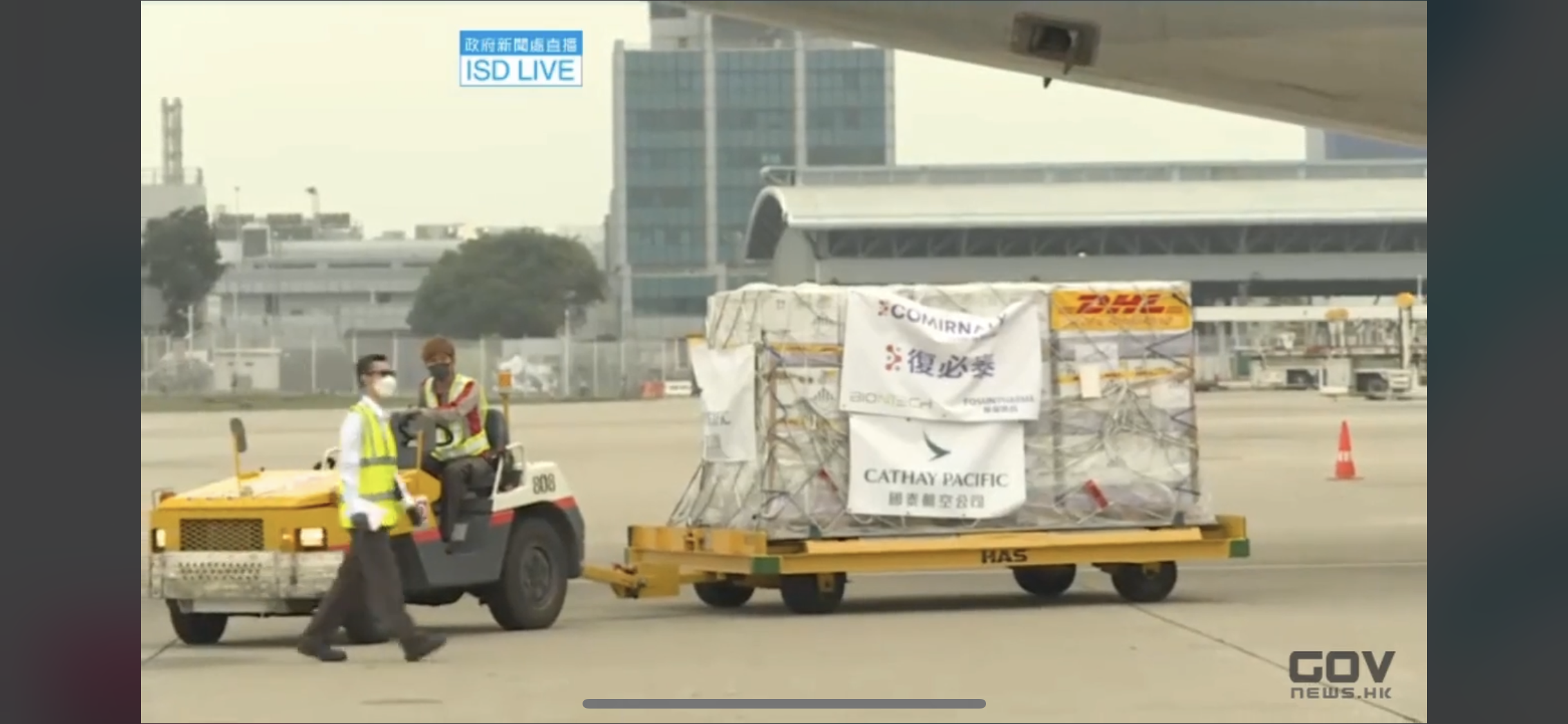 負責統籌疫苗接種工作的公務員事務局局長聶德權、食物及衞生局局長陳肇始到機場視察。運載疫苗的國泰貨機早上10時許降落香港機場,並於早上約10時半過後在停機坪卸貨。
