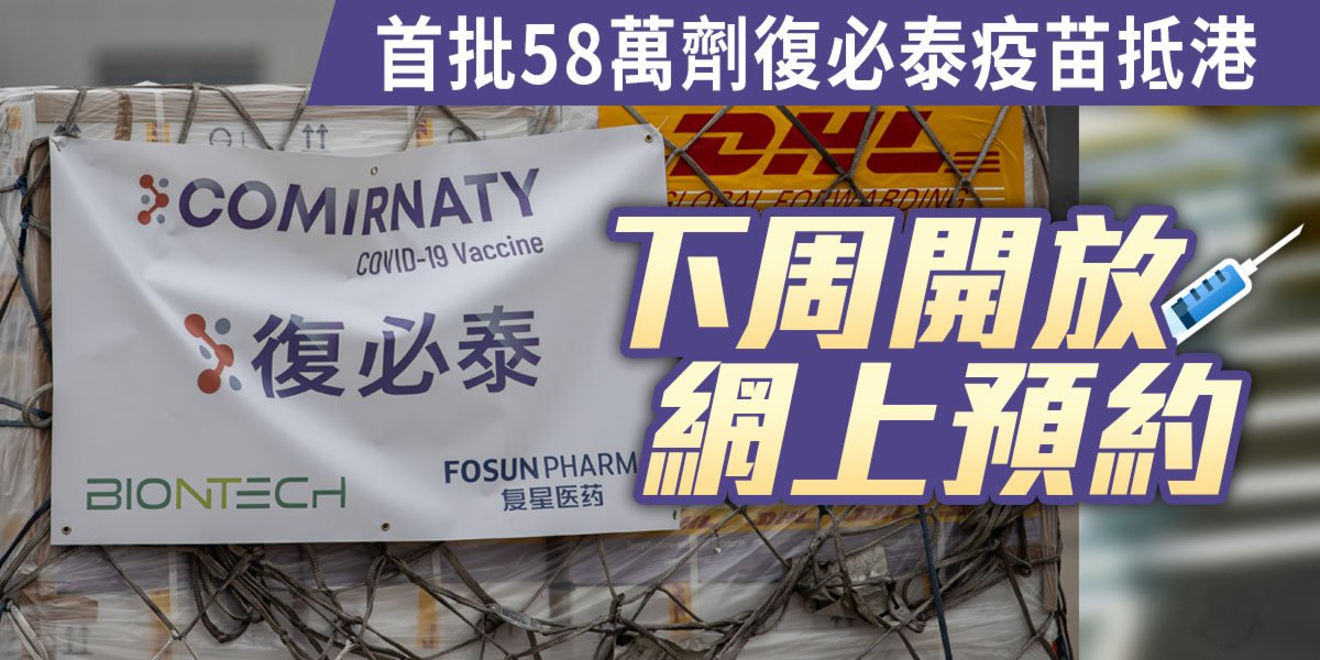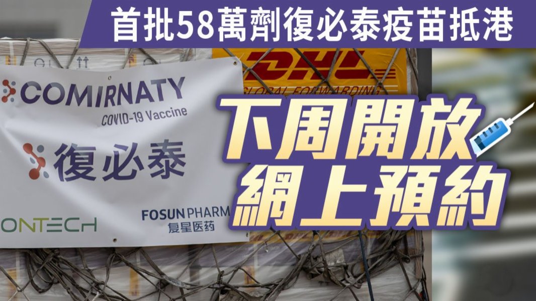 大公文匯全媒體報道,政府今日(27日)表示,由復星醫藥與BioNTech共同開發的復必泰疫苗會從德國分兩班航班運送到港。本港訂購的首批復必泰疫苗共有100萬劑,今日已運抵香港的有58萬5千劑,餘下劑量將於3月初運送抵港。政府發言人表示,因應復必泰疫苗抵港,將會在下周開放網上預約系統,讓市民預約接種復必泰疫苗,具體安排會適時公布。