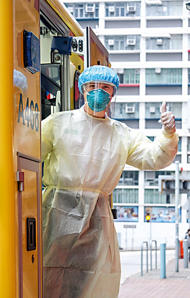 (大公報記者 葉浩源 文澔)穿上全套防護裝備的抗疫人員,這一年頻頻見報。他們是新冠肺炎疫情下蒙面的無名英雄,他們冒着染疫風險,走在抗疫最前線,每天在病毒刀尖上奔波,接送確診或疑似患者到醫院和檢疫中心。