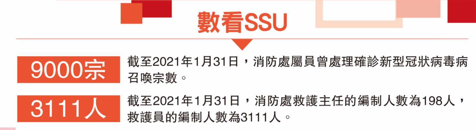 消防處高級救護主任(特別支援)彭思遠(小圖)表示,疫情爆發以來,有三次事件最為深刻,亦是對消防處救護人員的重大挑戰。第一次是「世界夢號」郵輪事件;第二次是因應政府要求所有入境旅客均須接受病毒測試,因涉及航機和人數眾多,SSU需大規模在機場守候支援,再次擔起運送疑似或確診患者的重任;第三次是近期爆發的第四波疫情,一間老人院舍需要撤離,涉及約50名院友,當中有人屬疑似或確診患者,多人列為緊密接觸者,消防處需出動多輛SSU救護車接載,並對有需要協助的長者加以護理。
