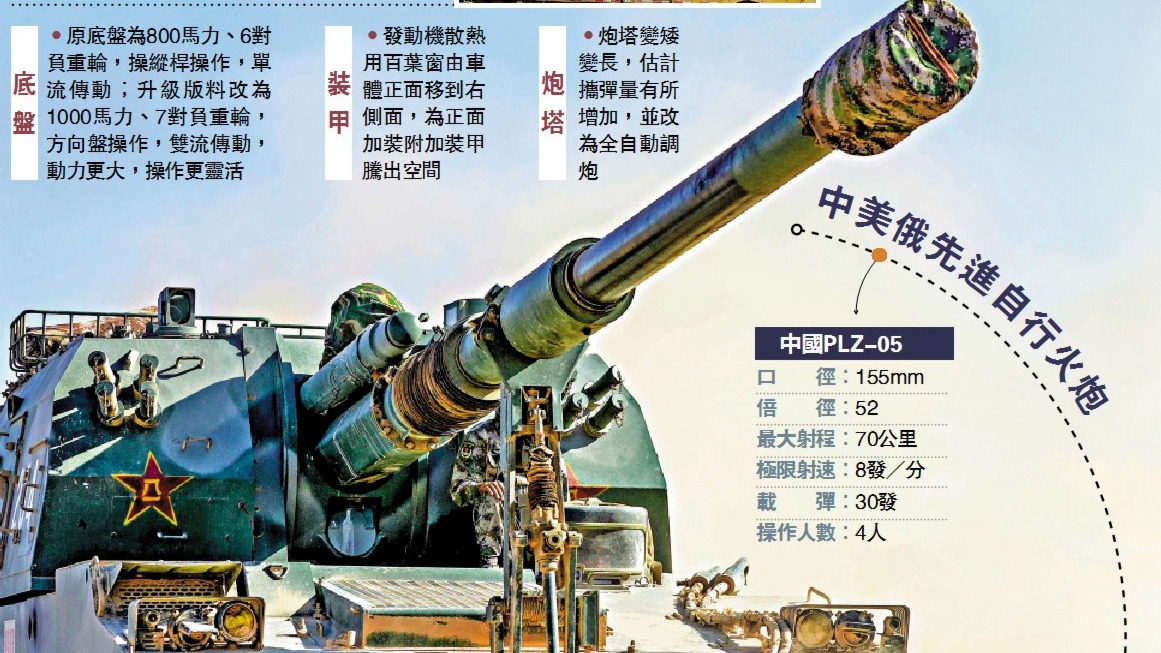 PLZ-05型自行加榴炮,是解放軍正式裝備的首款155毫米履帶式自行火炮,重量達45噸,最高時速為55公里,發射底排榴彈時最大射程超過50公里,火箭增程底排彈射程則可達70公里。並裝備了數字化綜合火控系統,是目前陸軍進行遠程火力支援的主戰裝備。雖然近幾年陸軍列裝了機動性更高的PCL-181型155毫米車載加榴炮,但其火炮射速及防護性能均不及PLZ-05。