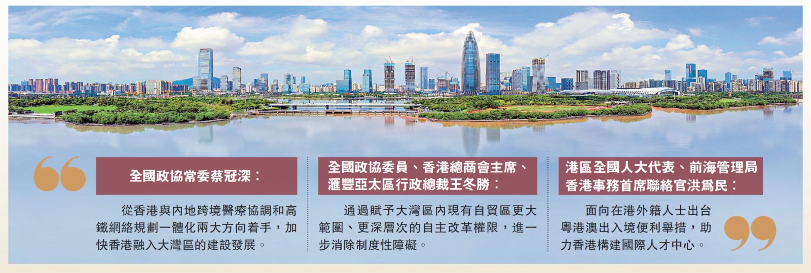 蔡冠深還希望國家能進一步為香港青年人在內地創業就業和生活提供更全面的支援,包括粵港兩地政府共同設立一個長期的大灣區青年就業機制,並簡化灣區城市的個稅徵收,從而吸引更多香港年輕人到大灣區內地城市發展。