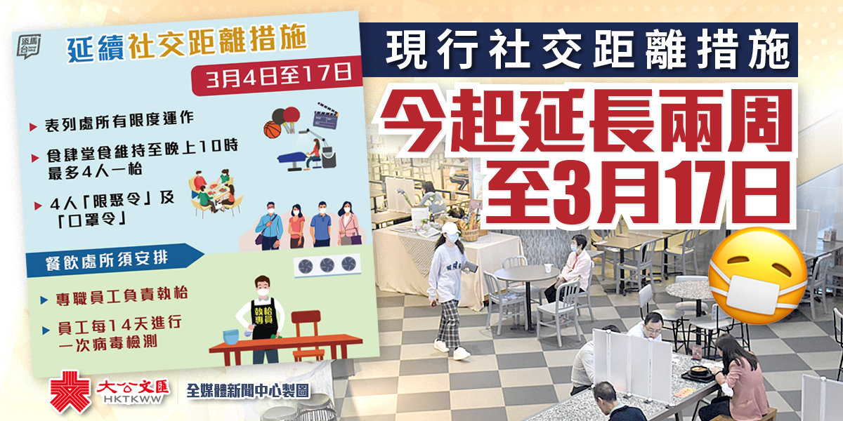 大公文匯全媒體報道,全球新冠肺炎疫情持續,本港自去年11月下旬爆發第四波疫情以來,近日雖然稍為紓緩,但社區隱形傳播鏈依未切斷。政府因此宣布,今日(4日)起繼續維持現行社交距離措施兩星期至3月17日,以免疫情反彈。