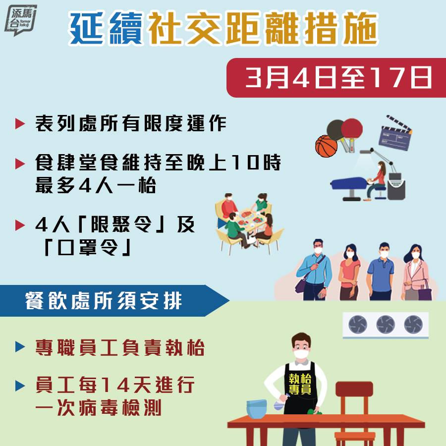 有關措施包括表列處所有限度運作;食肆堂食維持至晚上10時及每枱最多4人;4人「限聚令」及「口罩令」續實施。