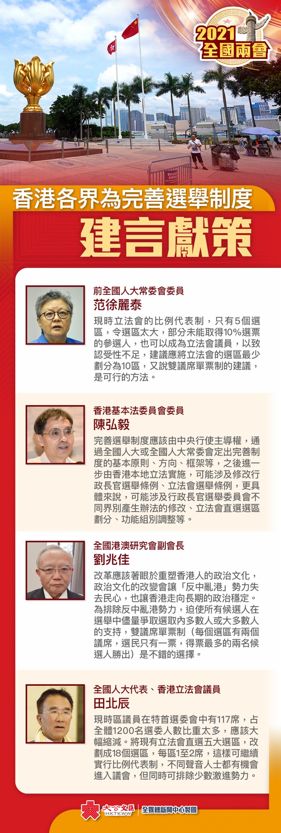 大公文匯全媒體報道,十三屆全國人大四次會議今日(5日)在京開幕,會議將審議全國人大常委會關於提請審議《全國人民代表大會關於完善香港特別行政區選舉制度的決定(草案)》的議案。近日來,來自香港多個界別人士均表示「愛國者治港」乃天經地義,大家紛紛為完善選舉制度建言獻策,提出了許多切實可行的具體建議,期待香港管治架構早日完全由愛國者主導,香港政治局面早日風清氣正,確保「一國兩制」行穩致遠。
