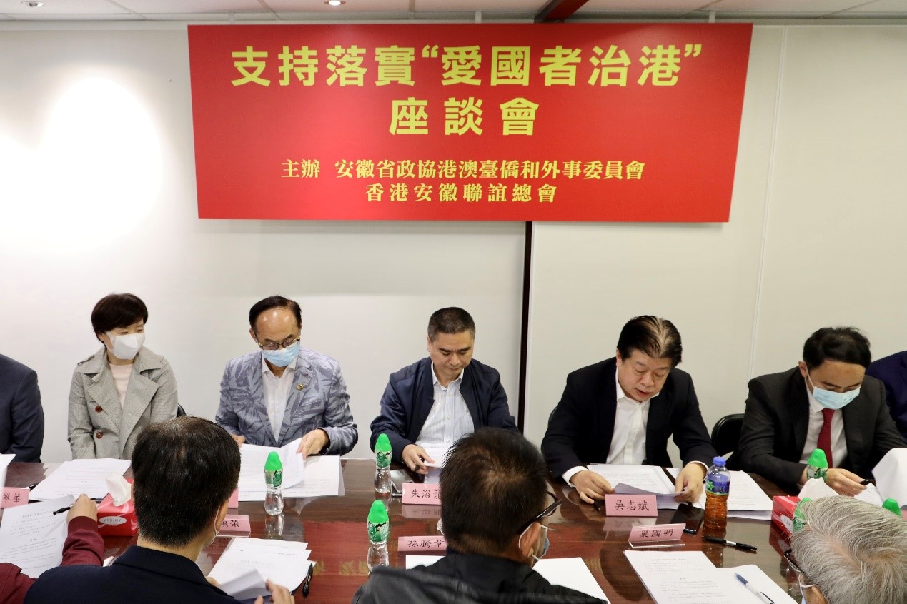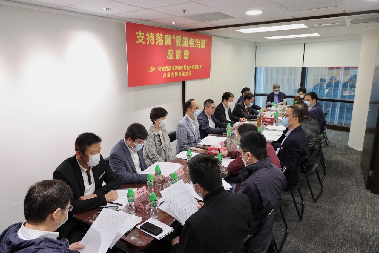 大文新聞網報道,3月5日下午,由安徽省政協港澳台僑和外事委員會、香港安徽聯誼總會聯合主辦的支持落實「愛國者治港」座談會在聯誼總會會址召開。會議由安徽省政協港澳台僑和外事委員會副主任、香港安徽聯誼總會負責社會事務常務副會長吳志斌主持,部分第十二屆安徽省港區政協委員、香港安徽聯誼總會第四屆理事會在港工作骨幹出席會議。