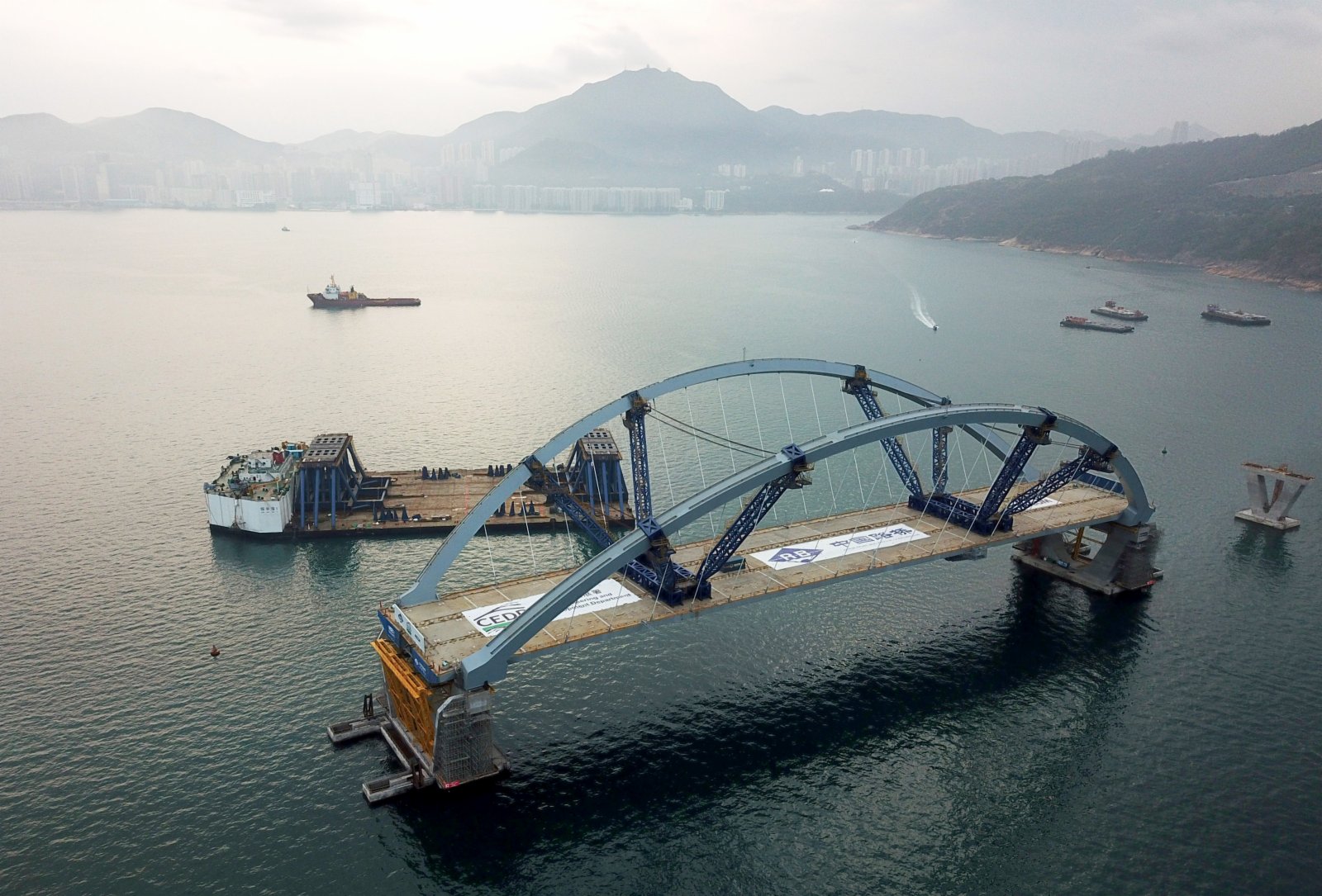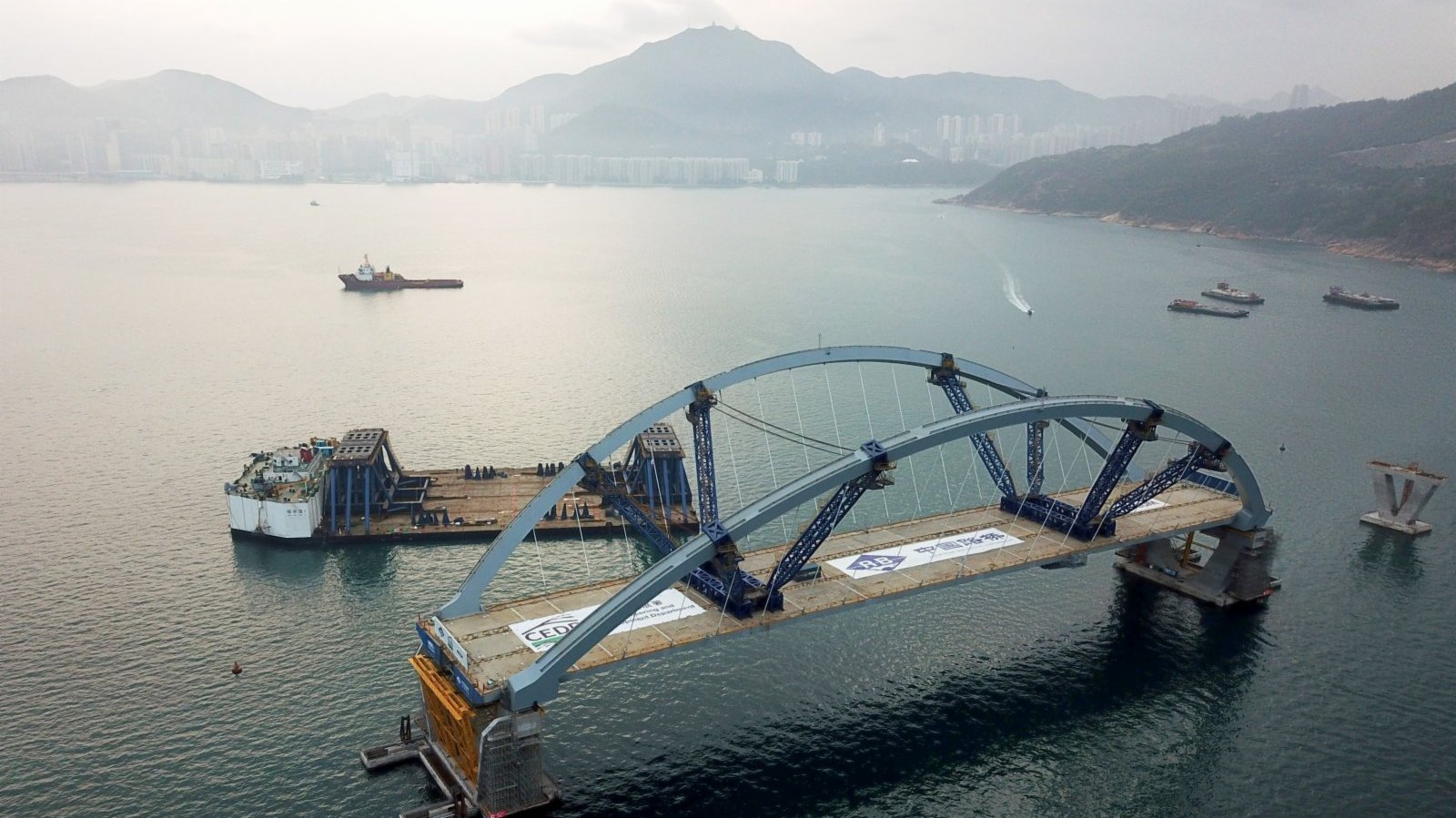 2月26日,將軍澳跨灣大橋主橋順利完成浮托安裝,浮托安裝總重達12000噸,總長214米,創造國內單體拱橋整體安裝的新紀錄。