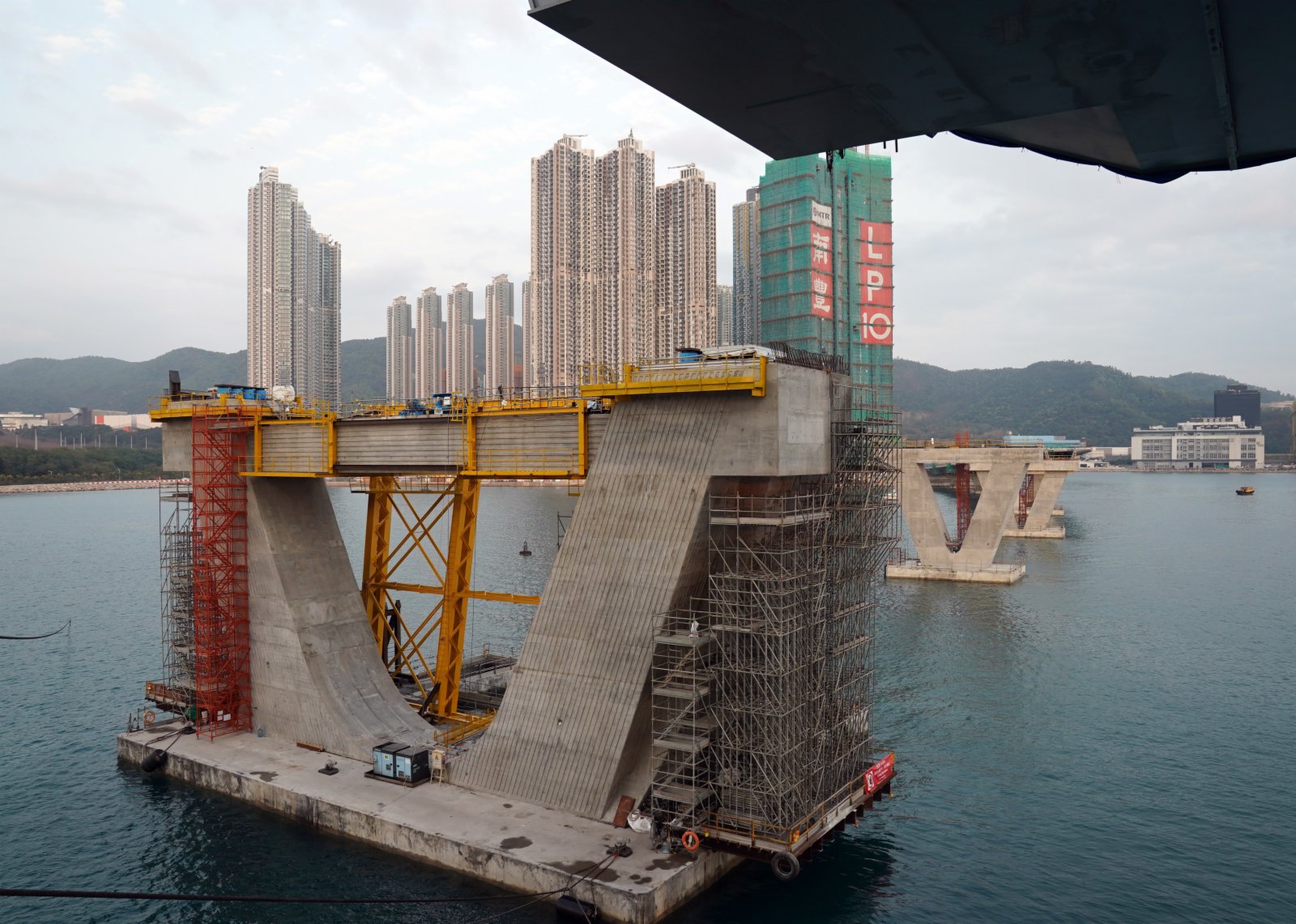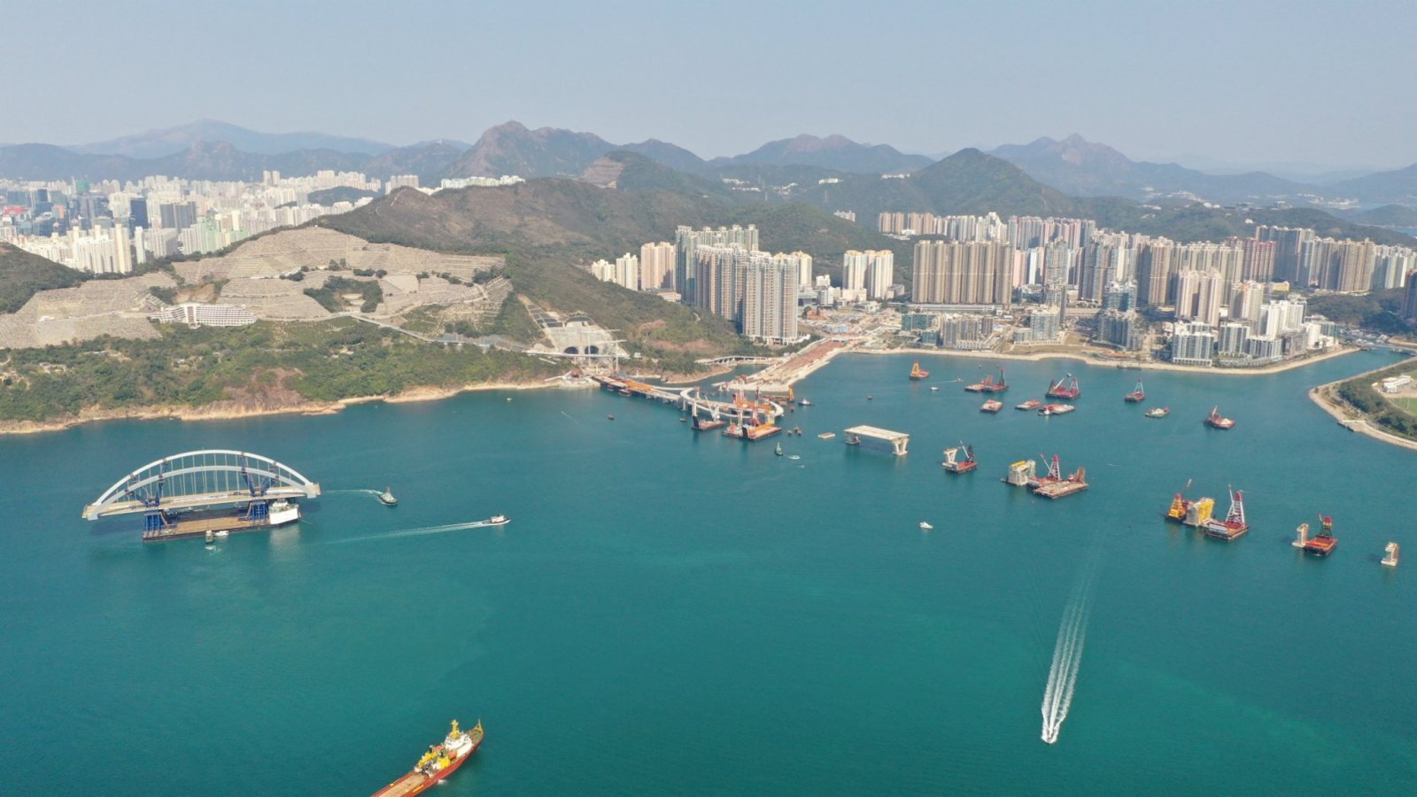 2月25日傍晚,將軍澳海灣斜陽夕照,波光粼粼。遠遠看去,一艘巨大的駁船「馱」着一座雙拱鋼橋靜靜地停泊在海面中間。