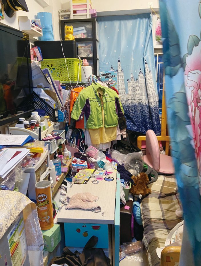 站在屋裏,我們無法面對面聊天,只能肩碰肩緊挨着站在一起,和我們一起的工聯會社區幹事和同事只能站在門外。空間局促,生活物件可不少,文具、玩具、衣物、雜物等擺滿了房間的每個角落,大部分的用品都屬於兄妹倆個。一張上下碌架床緊挨着窗邊,哥哥在床的上層捧著電腦做功課,妹妹正躺在下層玩耍。阿君說,平時她和女兒睡下層,兒子睡上層,睡覺的時候要把床上的東西(衣服、被子、書包等)擺到外面方能躺平;拉開擺滿柴米油鹽的塑膠置物架,才能打開洗衣機的門。換句話說,在這個家裏,想要完成要做的家務,基本上都需要「乾坤挪移」一番。而一應俱全的鍋碗瓢盆佔據了飯桌一大半的位置,阿君說,這些都是生活的必需品,在家裏做飯經濟實惠,也健康一些,為了孩子的營養,做飯煲湯都不可馬虎。