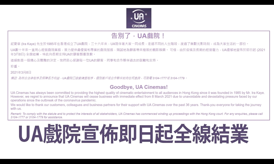 (大文新聞網記者 陳惠芳)新冠肺炎持續一年多,基於限聚令戲院三度停業,最近一次戲院停業多個月至2月18日才重開,然而UA院線官方網站周日(7日)晚上開始沒有更新,至凌晨其官網已無法登入;UA Cinemas 應用程式亦無法使用。至今早(8日)UA戲院在官網向影迷道別,指受疫情衝擊及經營壓力,「遺憾地宣布於即日起全線結業」,結束在港36年的業務,形容「這絕對是一個痛心及艱難的決定」,並向長期支持的顧客致歉,感謝每位顧客、同事和合作夥伴過去的鼓勵和支持。戲院已啟動清盤程序。