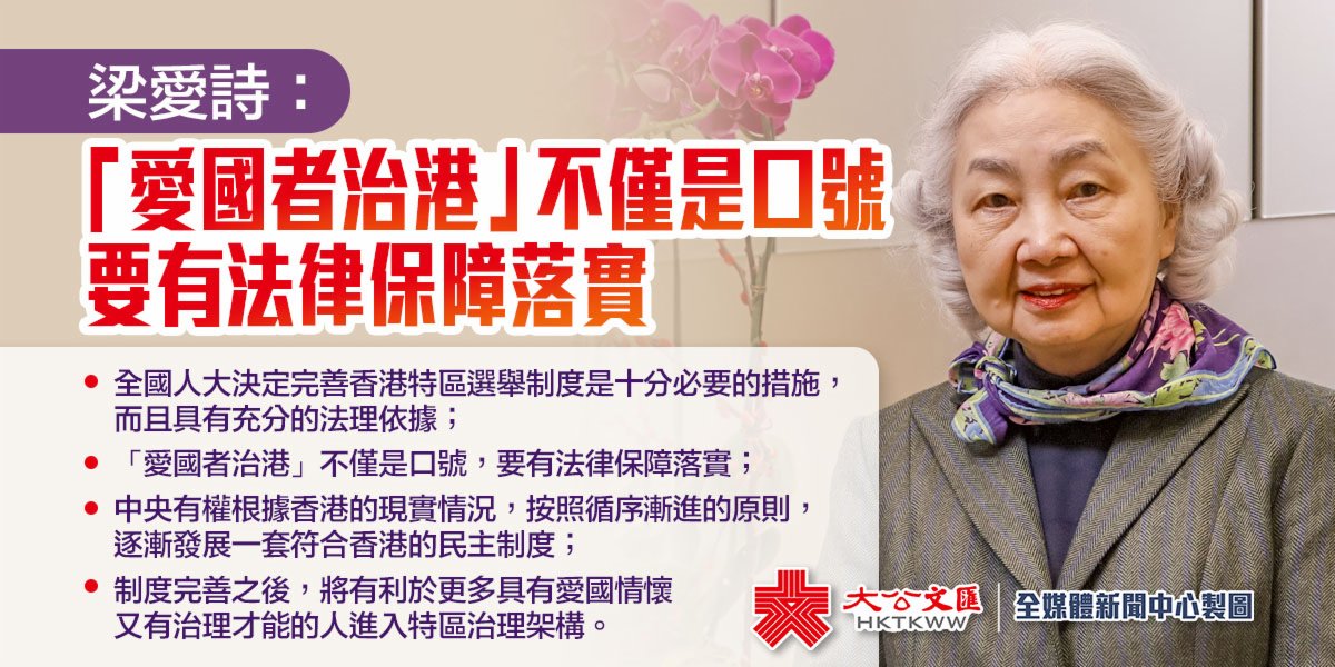 大公文匯全媒體報道,在北京召開的十三屆全國人大四次會議將就完善香港特區選舉制度作出決定。前律政司司長、基本法委員會前副主任梁愛詩9日接受新華社等媒體採訪時表示,全國人大決定完善香港特區選舉制度是十分必要的措施,而且具有充分的法理依據,完全符合憲法和香港基本法相關規定,有利於消除社會亂像,恢復香港繁榮穩定。她還說,「愛國者治港」不僅是口號,要有法律保障落實,選舉制度完善之後,香港會迎來更光明的前景。