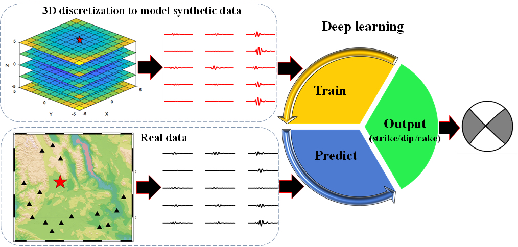 然而,從地震記錄推算地震震源機制是個計算耗時的過程,自1938年地震學家第一次開始推算地震斷層面解,震源機制參數一直是個研究性問題。目前世界各地地震監測台網在地震速報信息里只有發震時刻、震級、地點和深度,不包括震源機制參數,地震發生幾分鐘或更長的時間後才報出震源機制參數。張捷教授課題組採用人工智能方法有效地解決了這個複雜計算問題。應用完備的理論地震大數據訓練人工智能神經網絡,完善了該系統的準確性和可靠性,當地震發生後,實際地震數據進入人工智能系統,在不到1秒的時間內系統準確地估算出震源機制參數,大量實際數據測試證實了該方法的有效性,實現了該領域的重要突破。