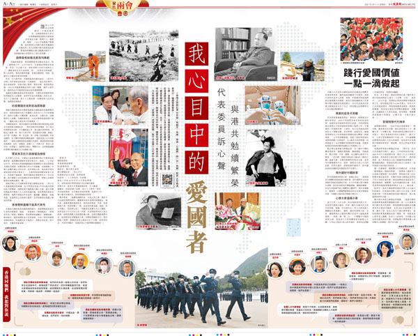 (香港文匯報記者 任芳頡、馬曉芳、朱燁、李理、江鑫嫻、趙一存、馬靜、凱雷 北京報道)今年兩會期間,「愛國者」成高頻話題。數千名全國人大代表和全國政協委員是中國國家治理的重要參與者。無論來自內地和香港,儘管地域不同、專業迥然、理念各異,他們共持着同一國度愛國者的文化認同。近日,十餘位代表委員在兩會期間接受香港文匯報記者連線採訪,娓娓講述自己心目中真正的愛國者,敘說自己愛國履職的點滴心得,並與香港同胞們共勉,同懷熱愛我們的國家,期待香港重拾正軌,與國家同行,繼續發展繁榮。