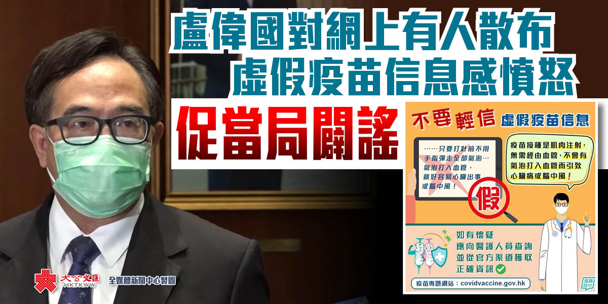 大公文匯全媒體報道,新冠肺炎疫苗開打近半個月,網上近日流傳帖文,指接種疫苗若不彈走全部氣泡會導致心臟出事或腦中風,政府昨日透過社交專頁「添馬台」澄清,指這説法完全沒有醫學根據。身在北京的全國政協委員、經民聯主席盧偉國今日(11日)表示,對香港社會上有人立心不良,散布虛假消息、造謠生事,企圖破壞疫苗接種計劃,感到非常憤怒,昨天已與聶德權和陳肇始溝通,敦促他們闢謠。