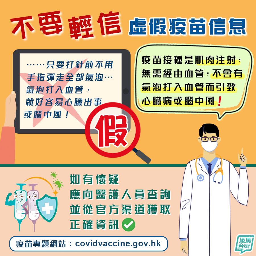 帖文又呼籲市民必須小心防範,指這類全無根據的不實資訊不但罔顧市民健康,亦損害香港利益。如收到任何有關疫苗的信息,最穩妥的方法是向醫護人員查詢,及從官方渠道獲取正確資訊。