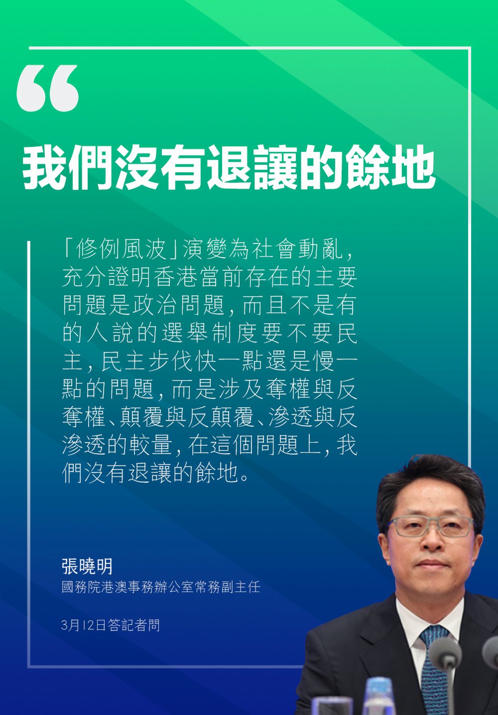 大文新聞網報道,12日,在國新辦新聞發布會上,國務院港澳事務辦公室常務副主任張曉明表示,香港當前存在的主要問題是政治問題,而且不是有的人說的選舉制度要不要民主,民主步伐快一點還是慢一點的問題,而是涉及奪權與反奪權、顛覆與反顛覆、滲透與反滲透的較量,在這個問題上,我們沒有退讓的餘地。