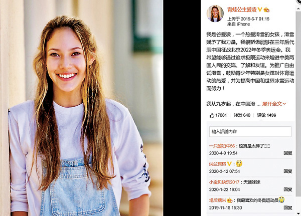 與此同時,她還在Instagram留言:「 我為自己的(中國)傳統感到驕傲,同時也為我在美國成長感到自豪。 2022年北京冬奧會是千載難逢的機會,可以激勵像我這樣數百萬年輕人,幫助我推廣自己喜歡的運動。 我希望通過滑雪來團結兩國人民,增進共識,加強交流,建立國家之間的友誼。 」