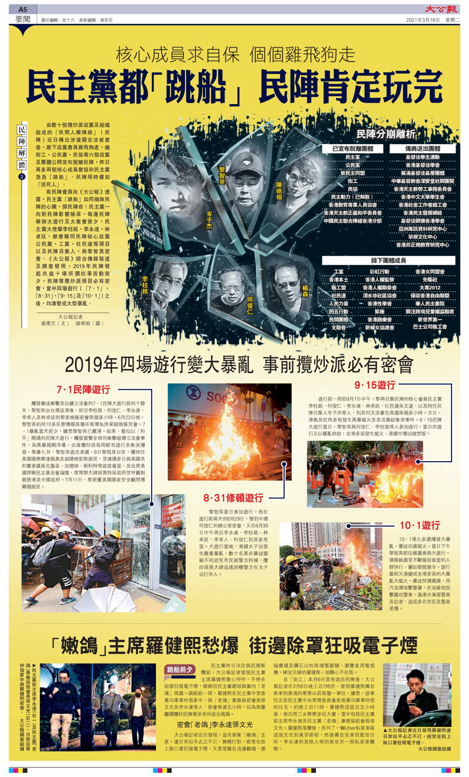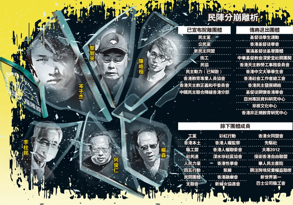 有民陣會員向《大公報》透露,民主黨「跳船」如同摘除民陣的心臟,攞民陣命!民主黨一向對民陣影響極深,每逢民陣舉辦大遊行及大集會前夕,民主黨大佬輩李柱銘、李永達、林卓廷,都會聯同民陣核心政黨公民黨、工黨、社民連等頭目以及民陣召集人,與黎智英密會。《大公報》綜合傳媒報道及調查發現,2019年民陣發起共逾十場所謂抗爭活動前夕,民陣等攬炒派頭目必有密會,當中四場遊行(「7·1」、「8.31」、「9·5」及「10·1」)之後,均演變成大型暴亂。